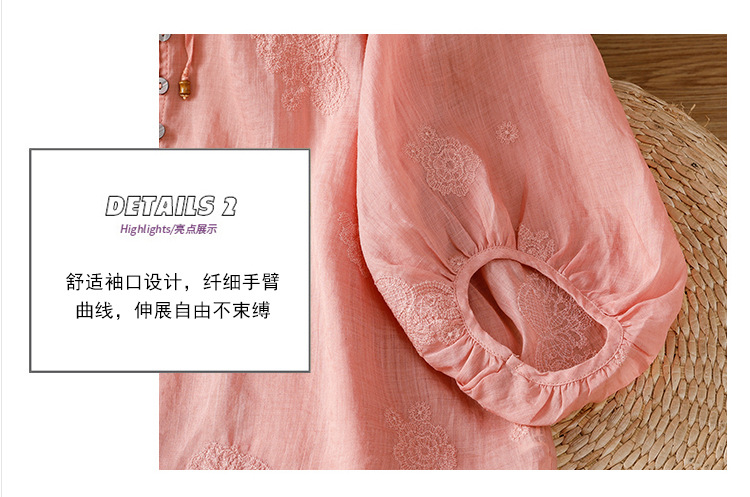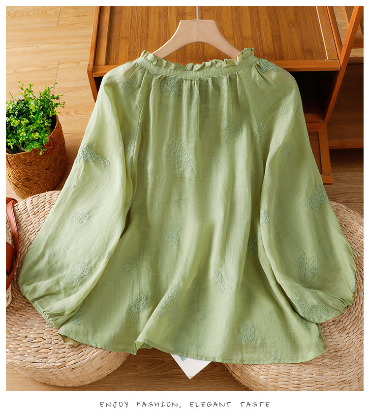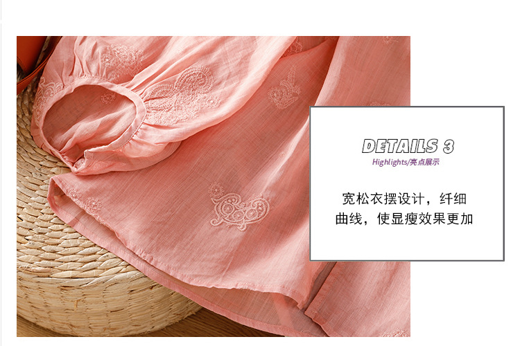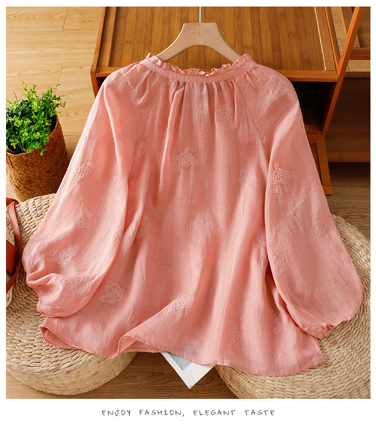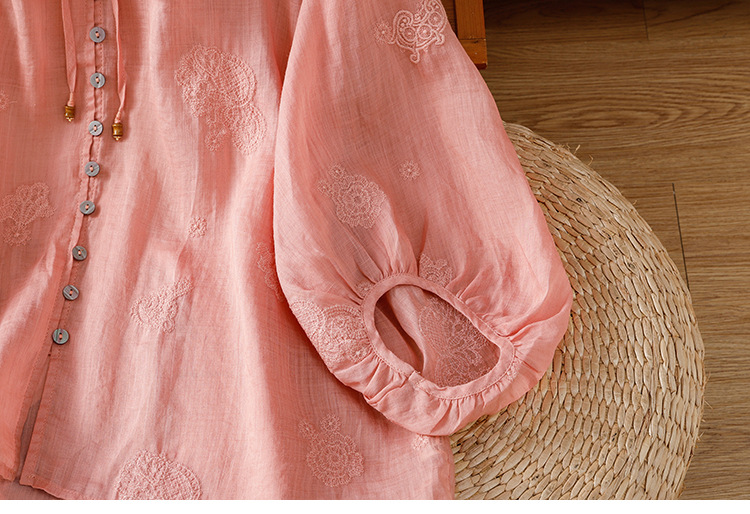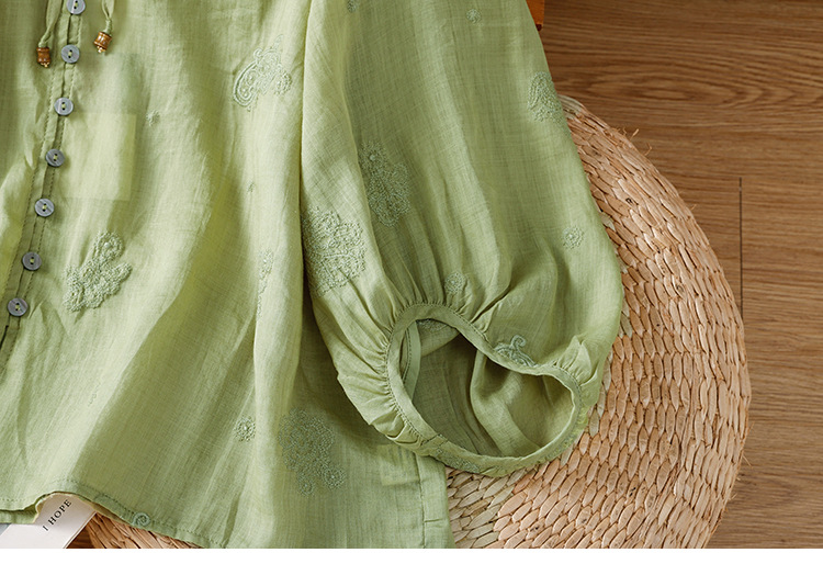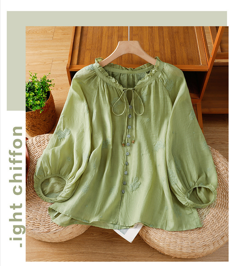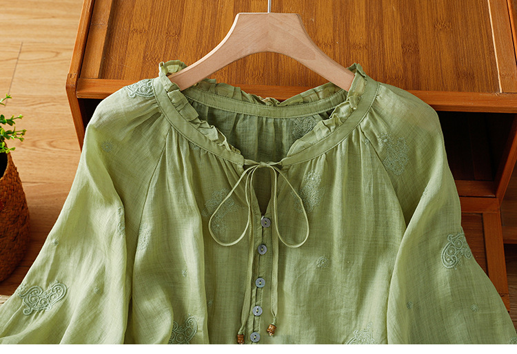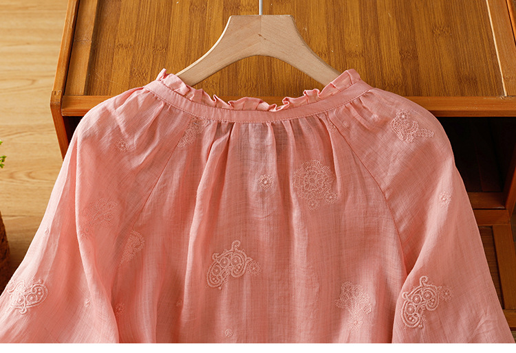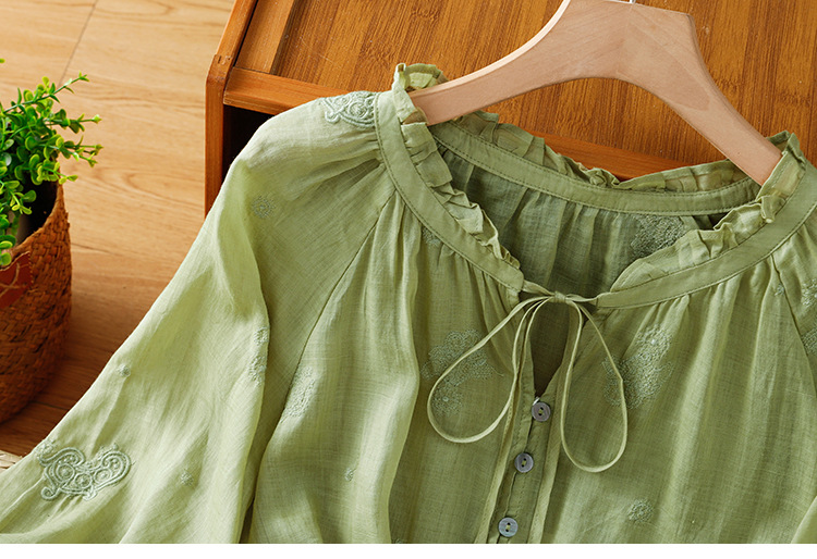 C039-92942025简约休闲复古夏季宽松系带刺绣花衬衫女花边领口文艺上衣女