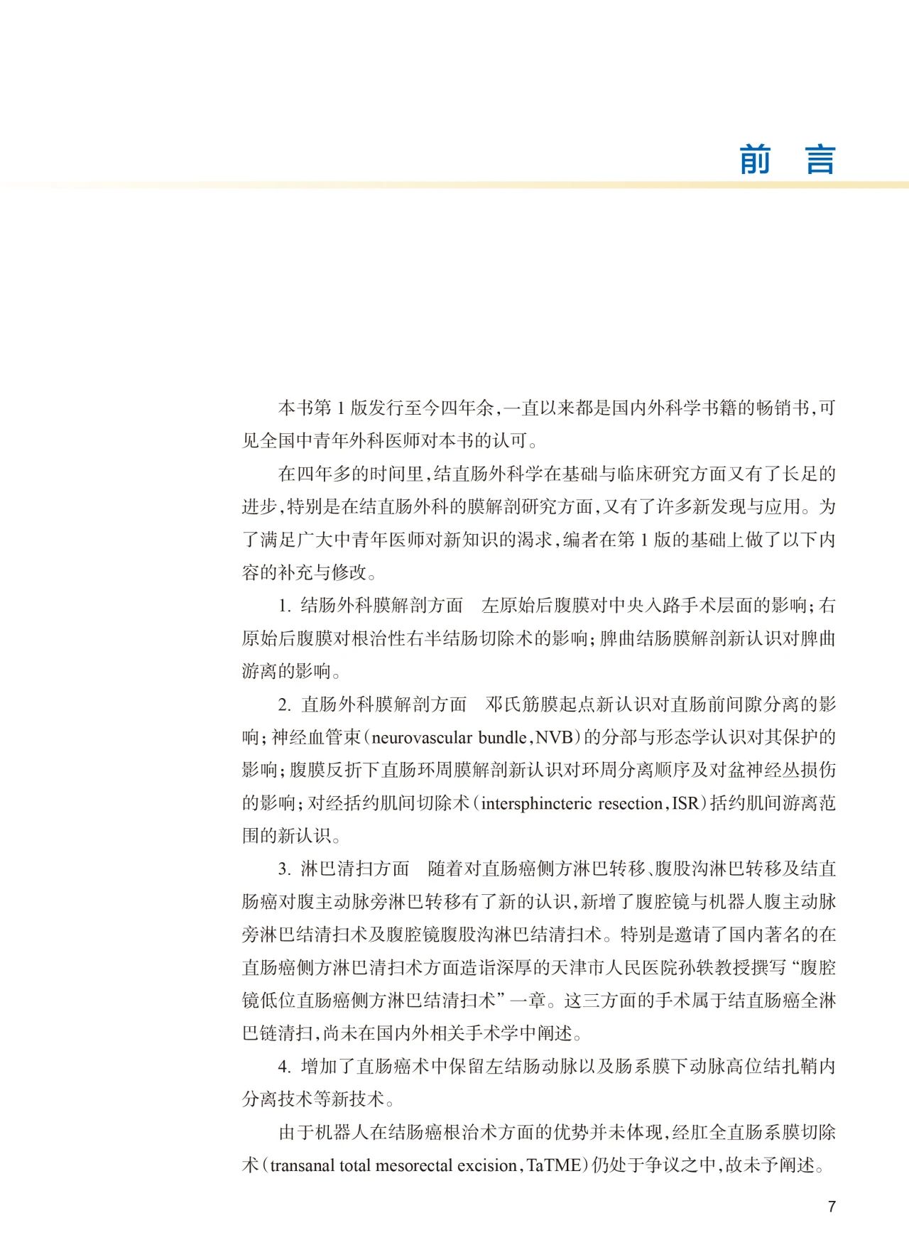 本书第1版在2019年出版后,深受广大读者喜爱。为反映结直肠外科在基础与临床研究方面,特别是在膜解剖方面的新进展,修订第2版。此次修订仍延续第1版的编写风格,主要更新了对结直肠外科膜解剖方面的认识,新增了腹腔镜与机器人腹主动脉旁淋巴结清扫术、腹腔镜低位直肠癌侧方淋巴结清扫术、腹腔镜腹股沟淋巴结清扫术,以及直肠癌术中保留左结肠动脉和肠系膜下动脉高位结扎鞘内分离技术等,并大篇幅更新了手绘插图、手术高清照片和视频,有助于读者加深对手术精准性和安全性的理解与掌握。