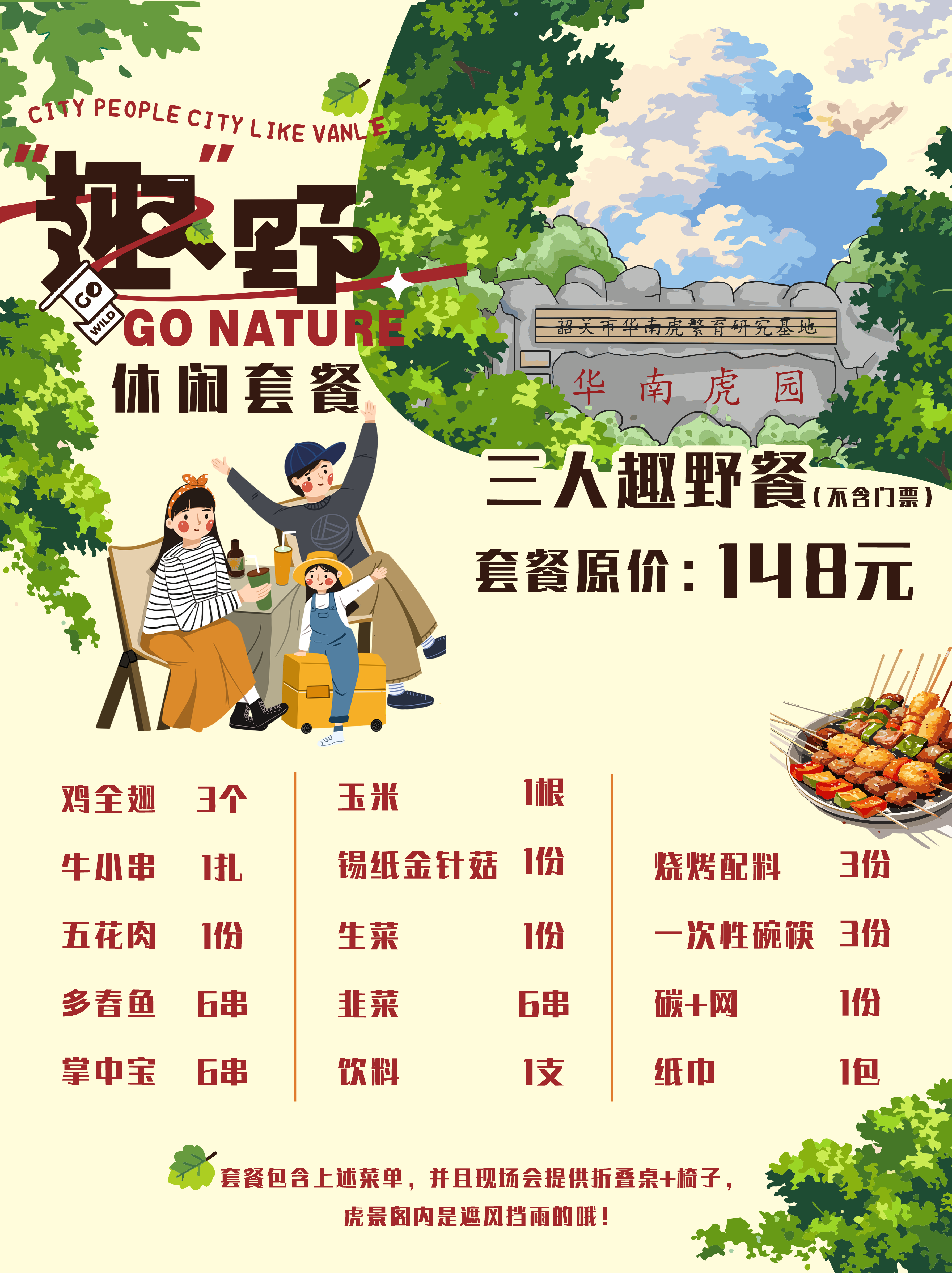 韶关森林公园【虎园BBQ】148元起享韶关华南虎园三人趣野烧烤趴,3人小聚,畅享滋滋作响的野趣!