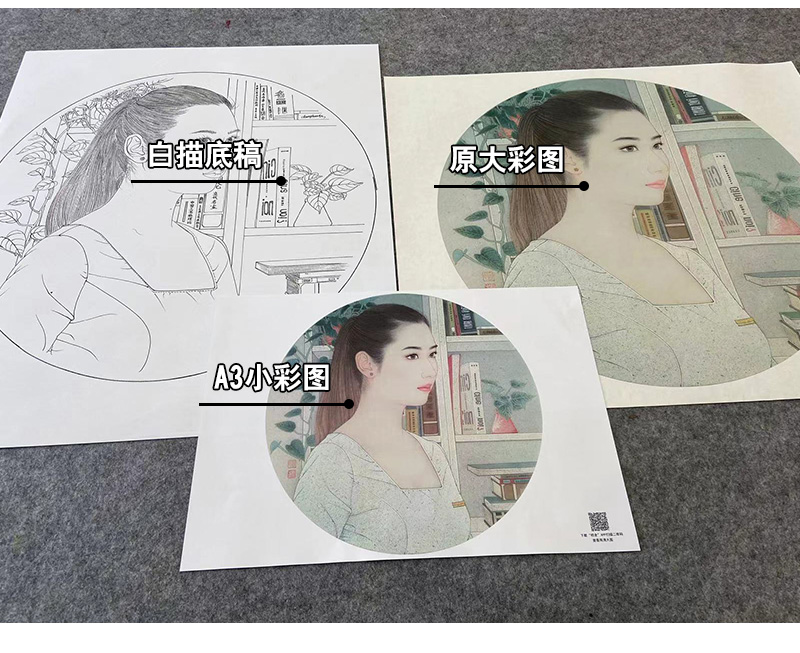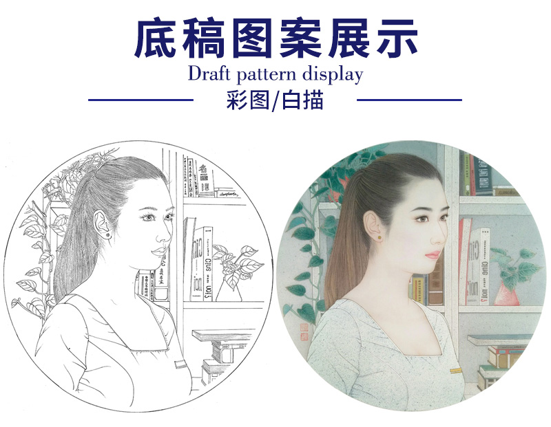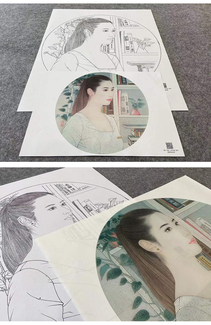 【大彩图】盘虎杰工笔画白描底稿圆形小品现代人物高清打印稿HJ39