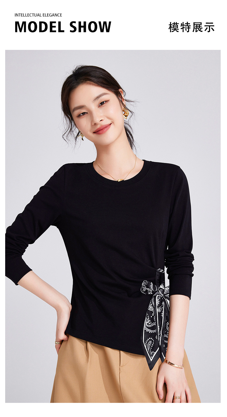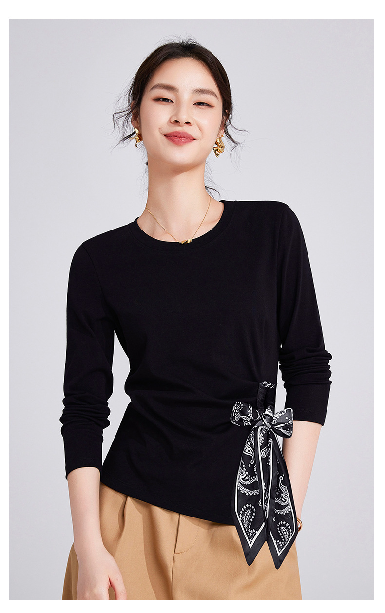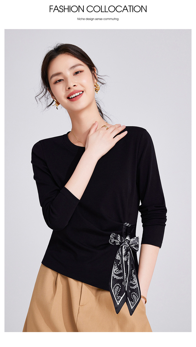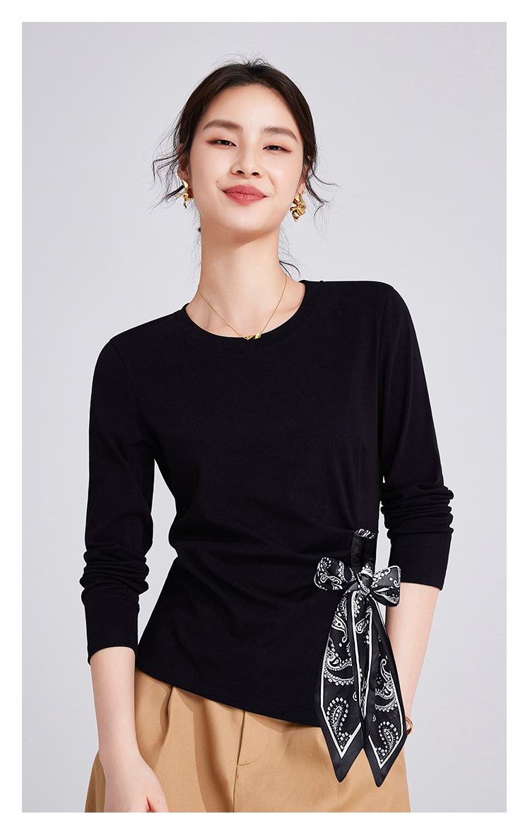 「自j」全新升级【铂金会员109/天猫149/差价40】(75105)洛诗琳高级感正肩长袖t恤2025秋季新款丝巾绑带打底上衣女