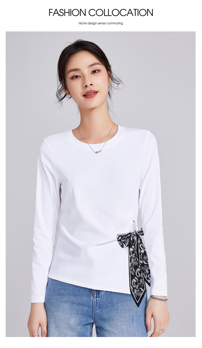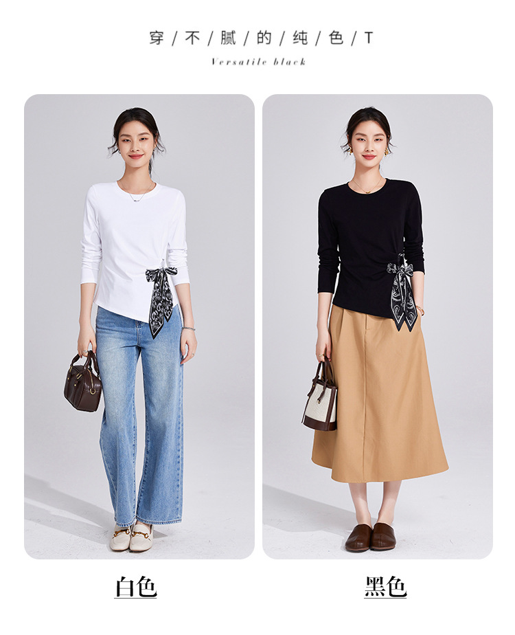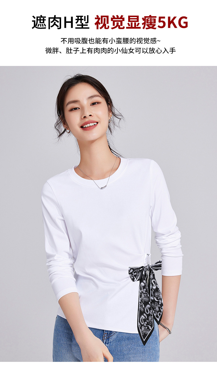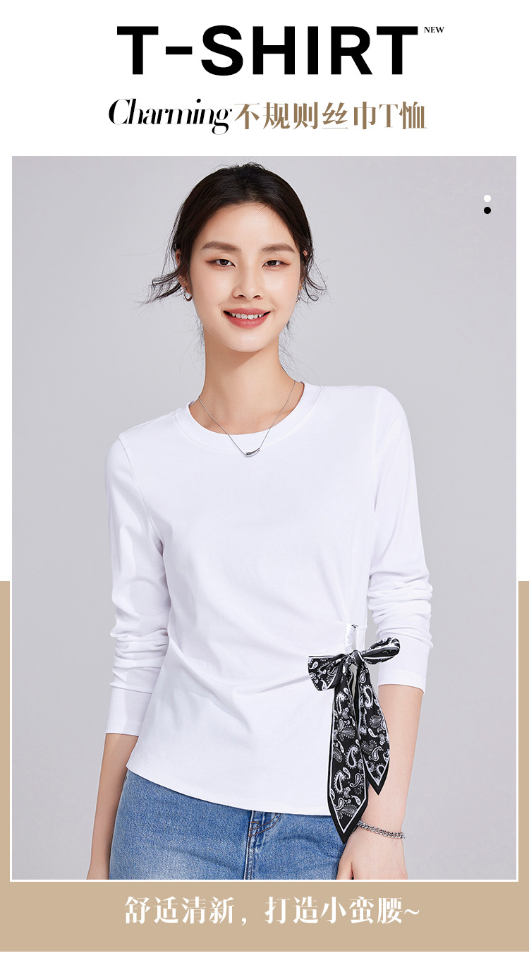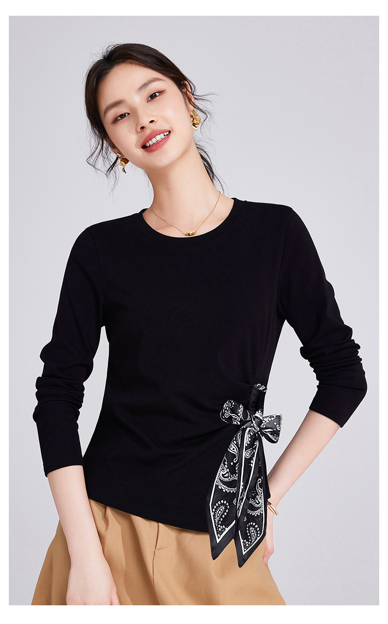 「自j」全新升级【铂金会员109/天猫149/差价40】(75105)洛诗琳高级感正肩长袖t恤2025秋季新款丝巾绑带打底上衣女