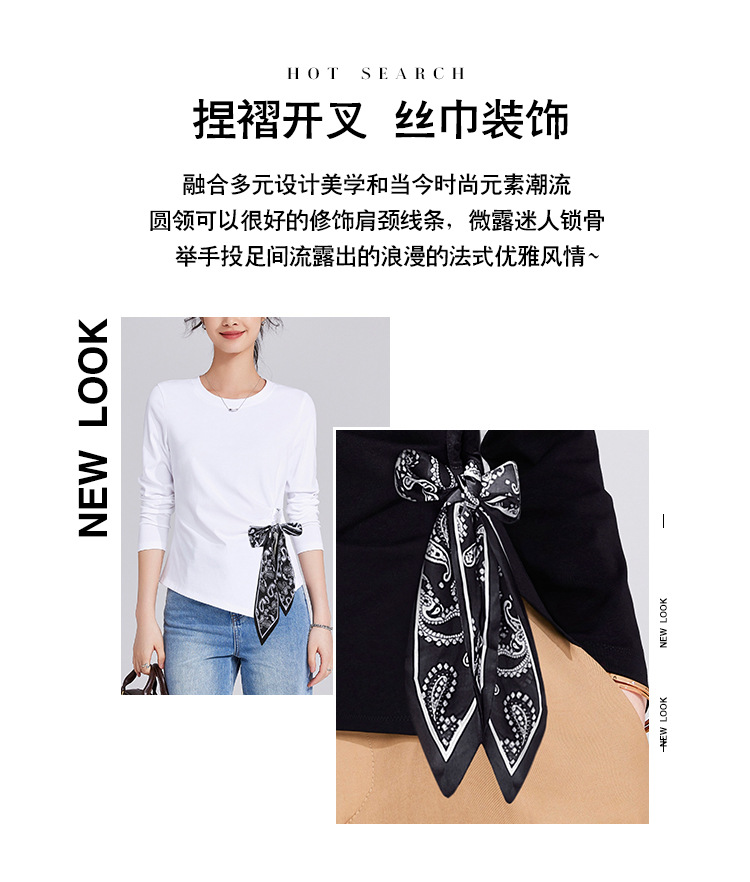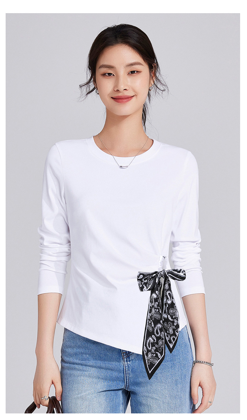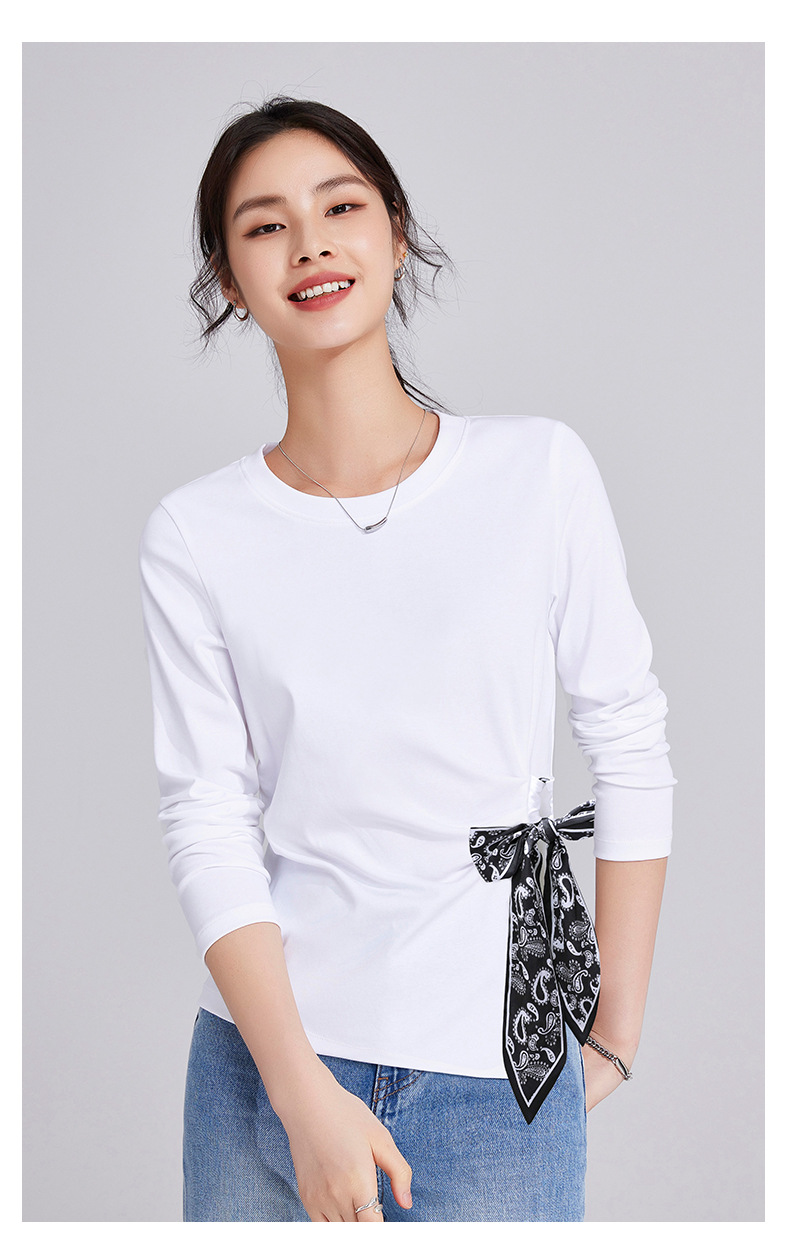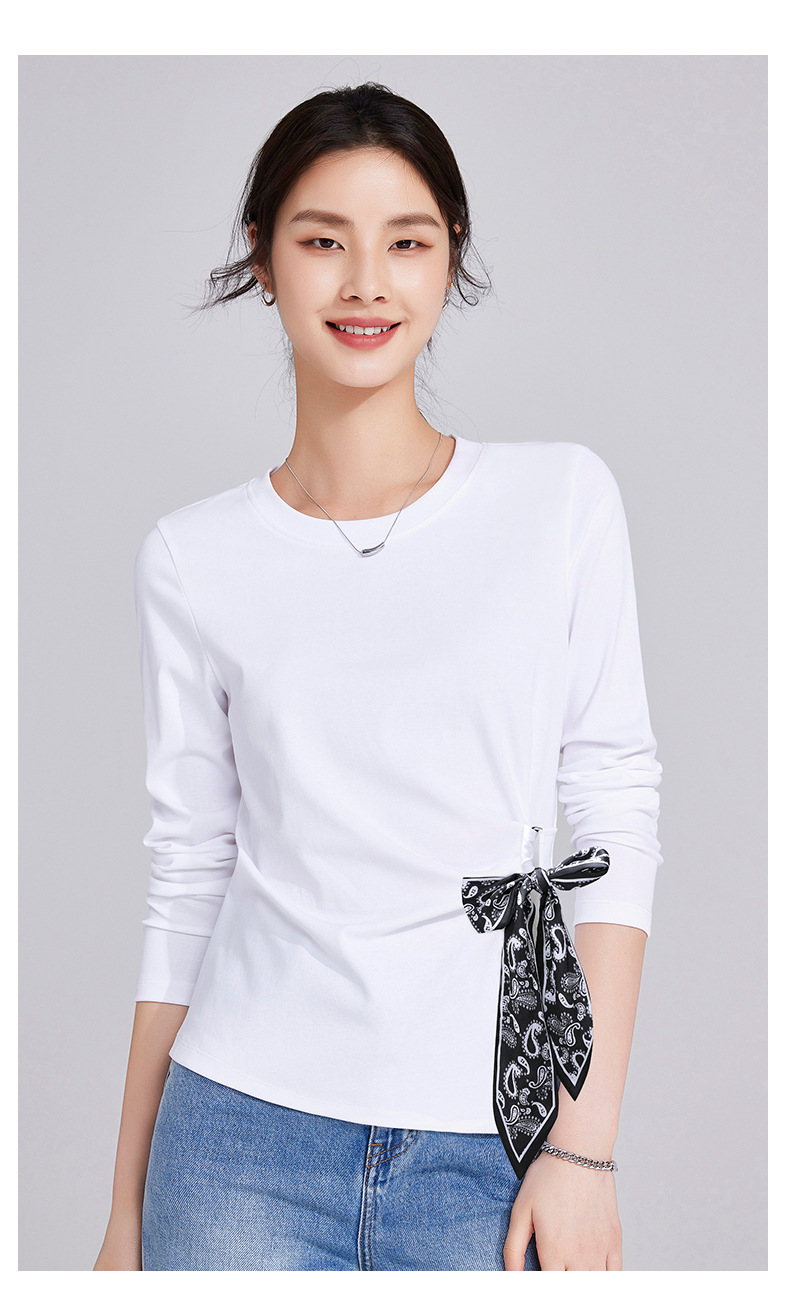 「自j」全新升级【铂金会员109/天猫149/差价40】(75105)洛诗琳高级感正肩长袖t恤2025秋季新款丝巾绑带打底上衣女