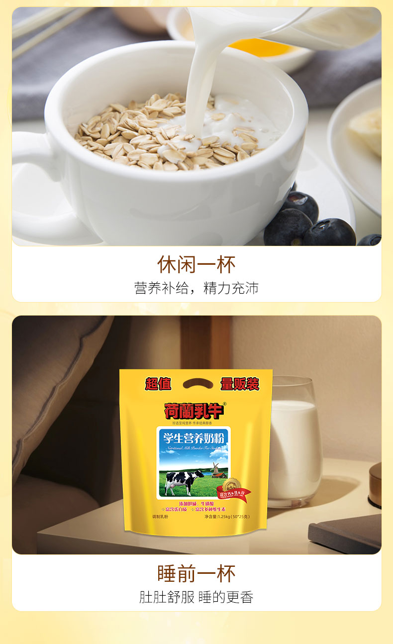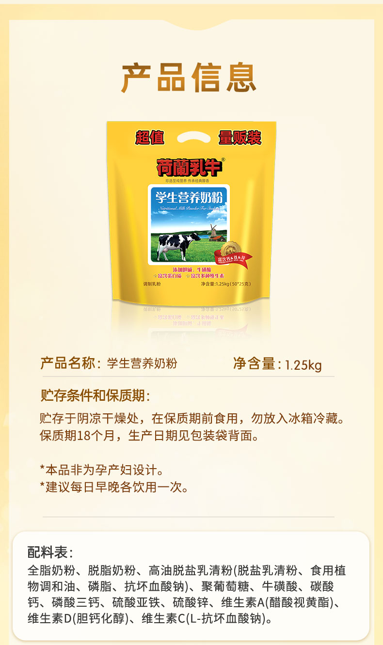 量贩版荷兰乳牛学生营养奶粉1.25kg(50*25g) 25年12月产