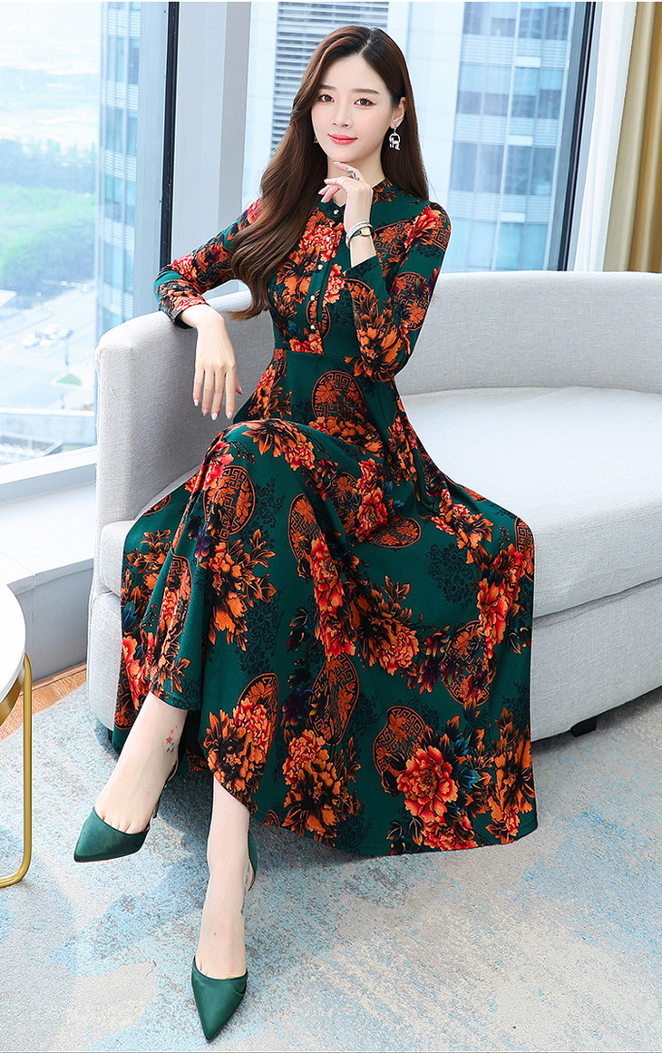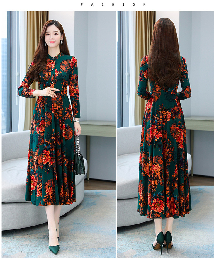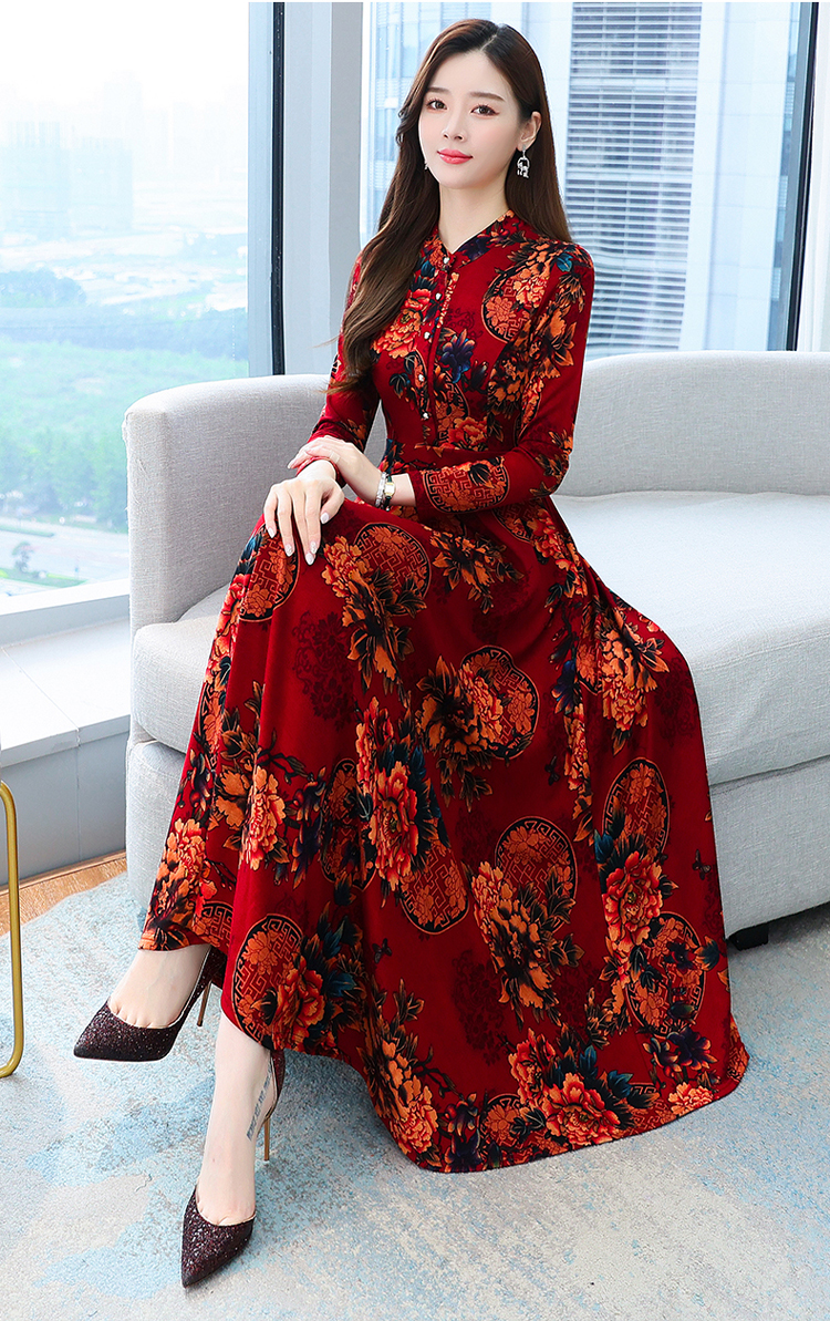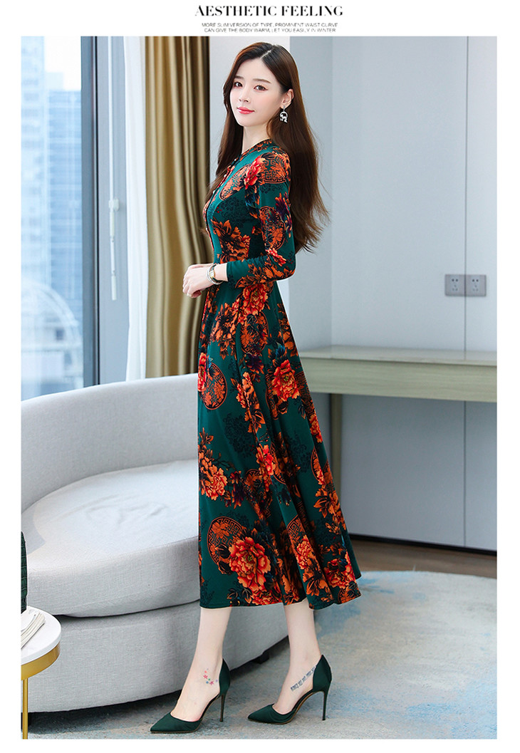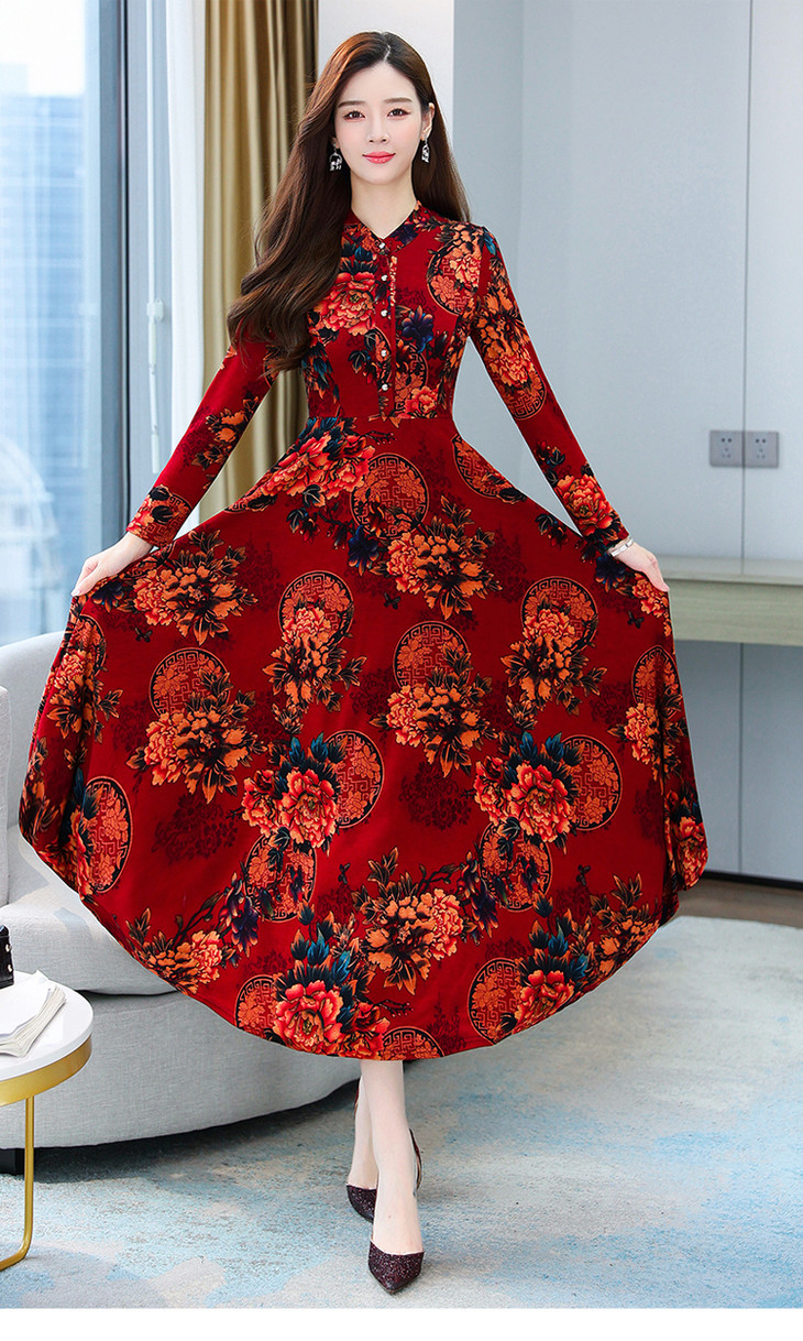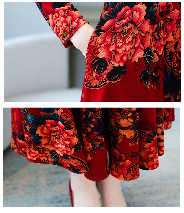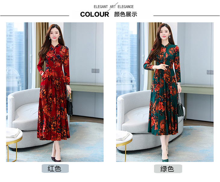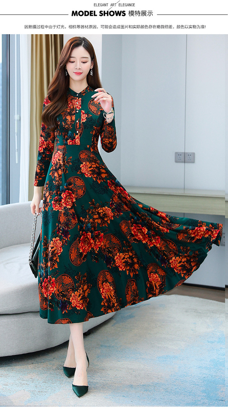 XYFS6209 秋装新款修身复古印花针织显瘦气质大码长袖连衣裙