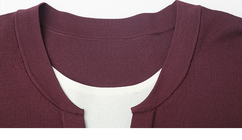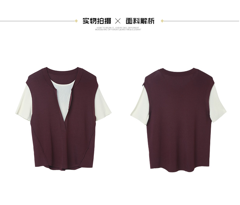 轻奢高级感假两件坑条针织衫女 安可拉红撞色 V 领短袖 T 恤 小个子通勤气质上衣