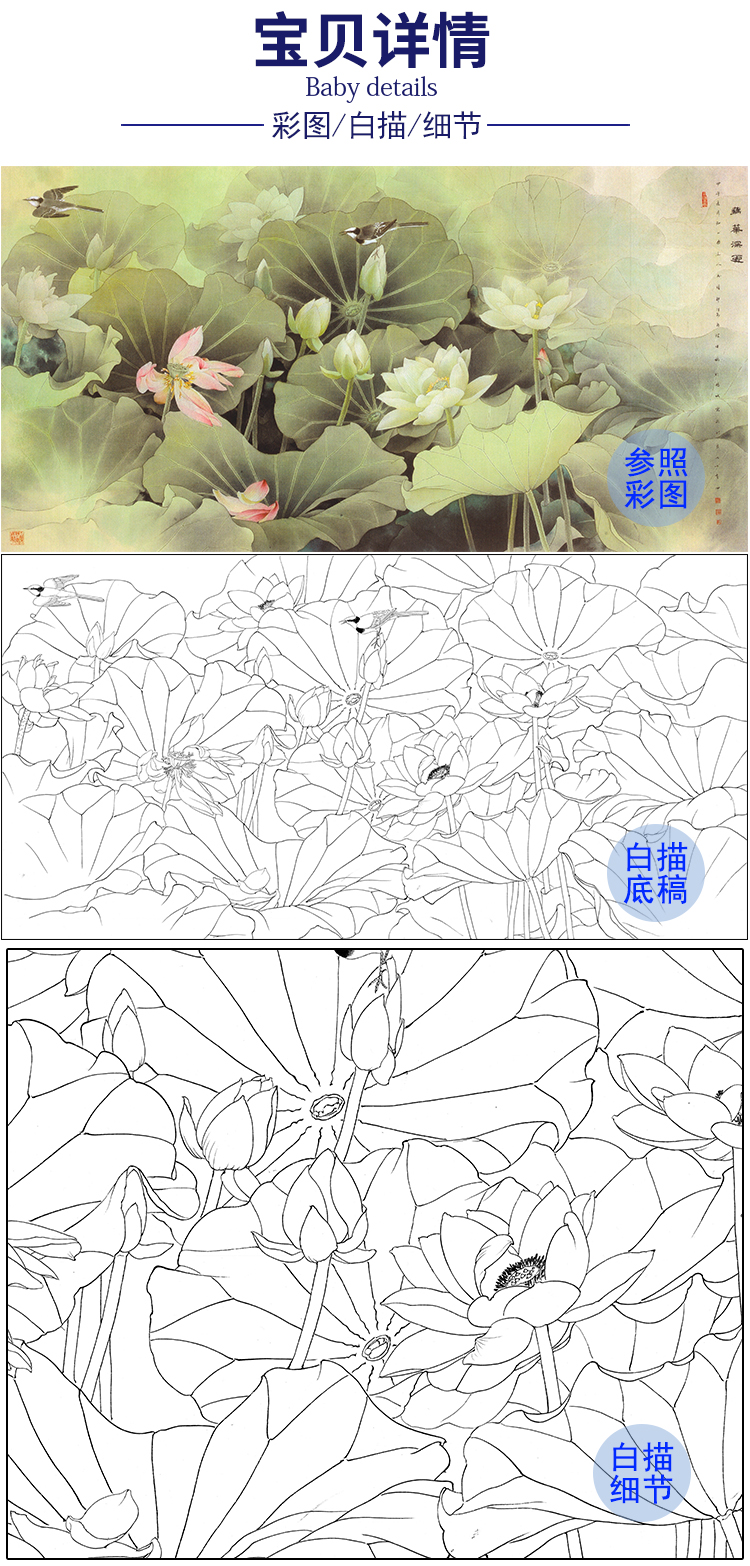 【有步骤、大彩图】李晓明工笔白描底稿斗方《荷花白鹭图》临摹勾线高清打印稿KB14