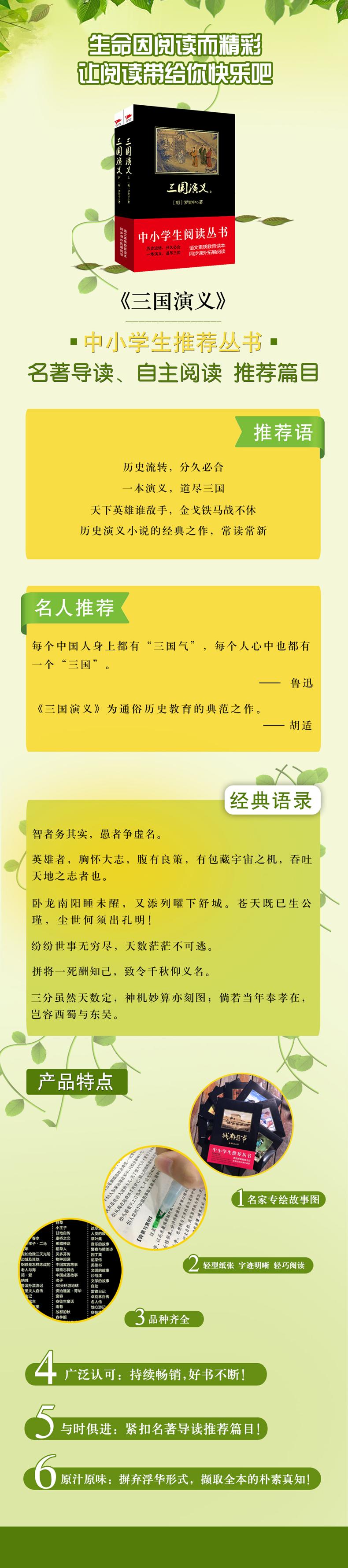 罗贯中创作的《三国演义(上下)》语言流畅,雅俗共赏,全书结构严谨,借鉴编年史的手法,将百年间错综复杂的历史事件和层出不穷的历史人物串联起来,叙述有条不紊,浑然一体,“温酒斩华雄”“过五关斩六将”“威震长坂桥”“单骑救主”“空城计”等故事更是广为流传,家喻户晓。