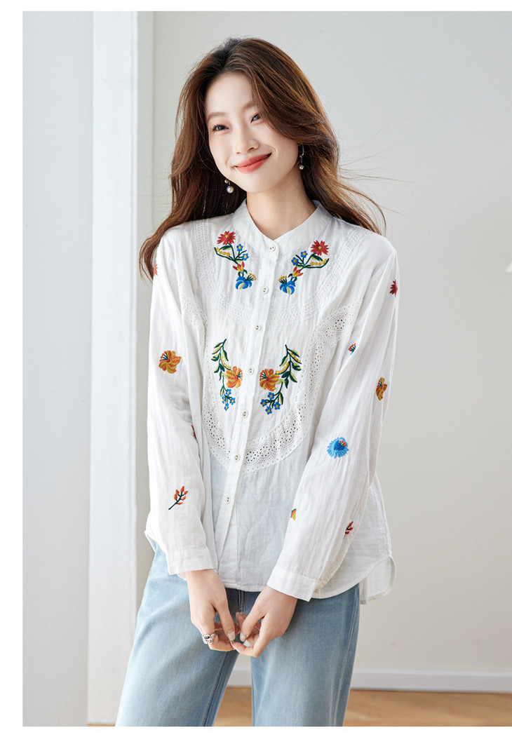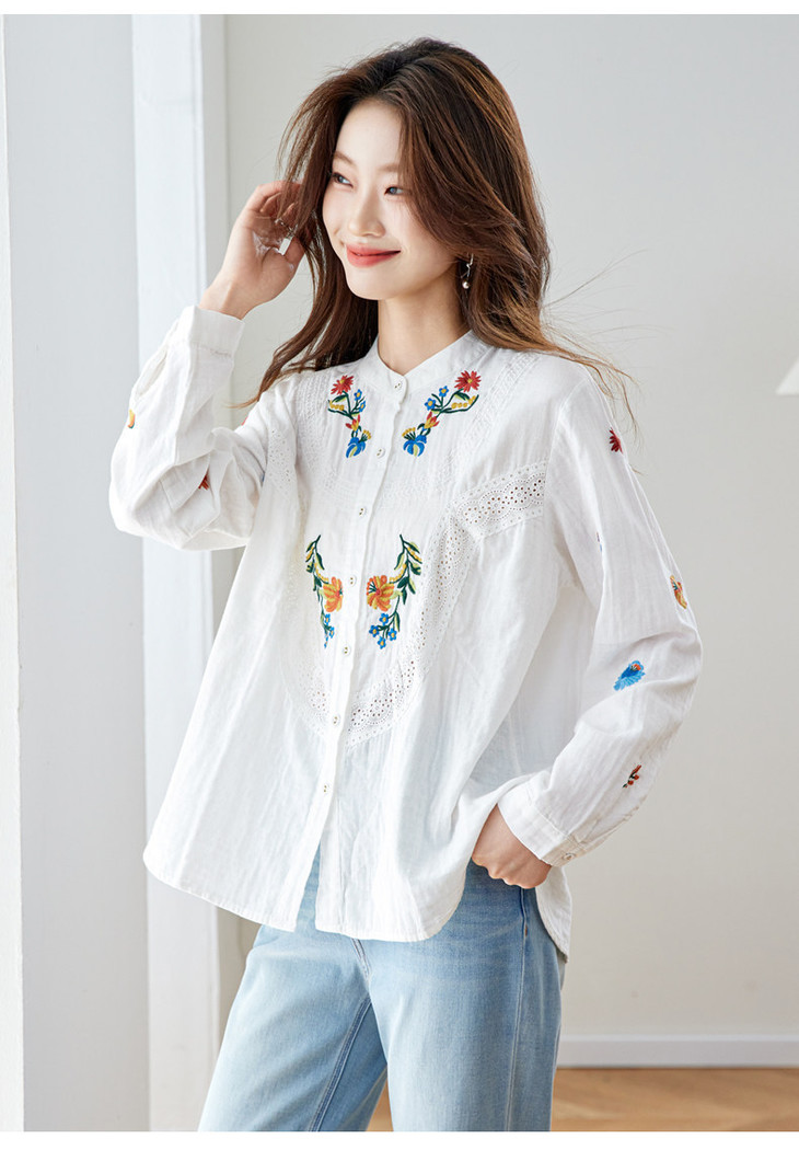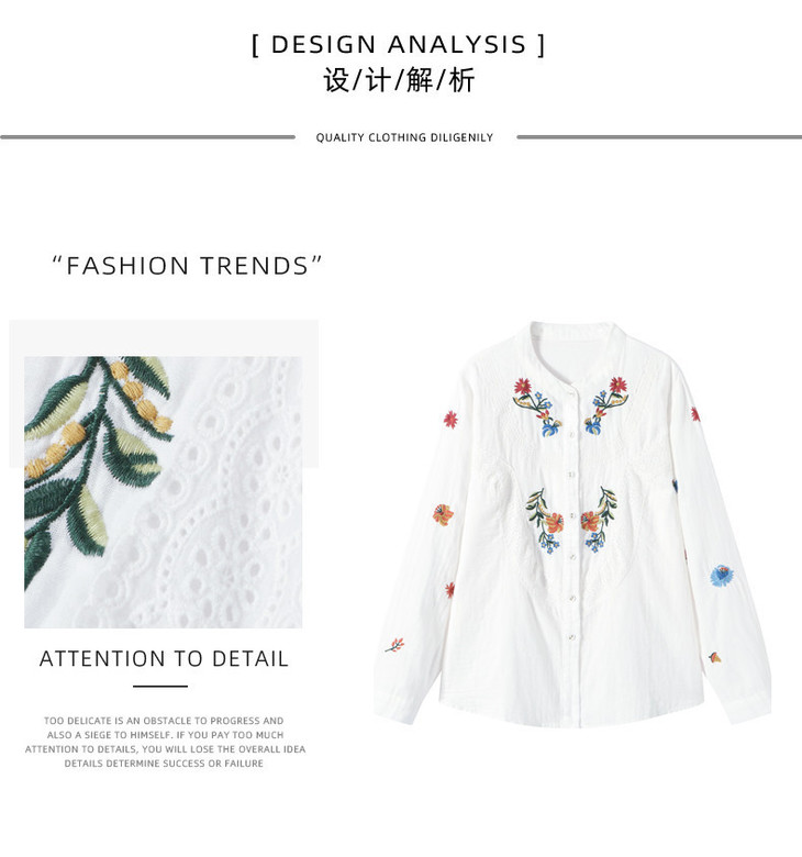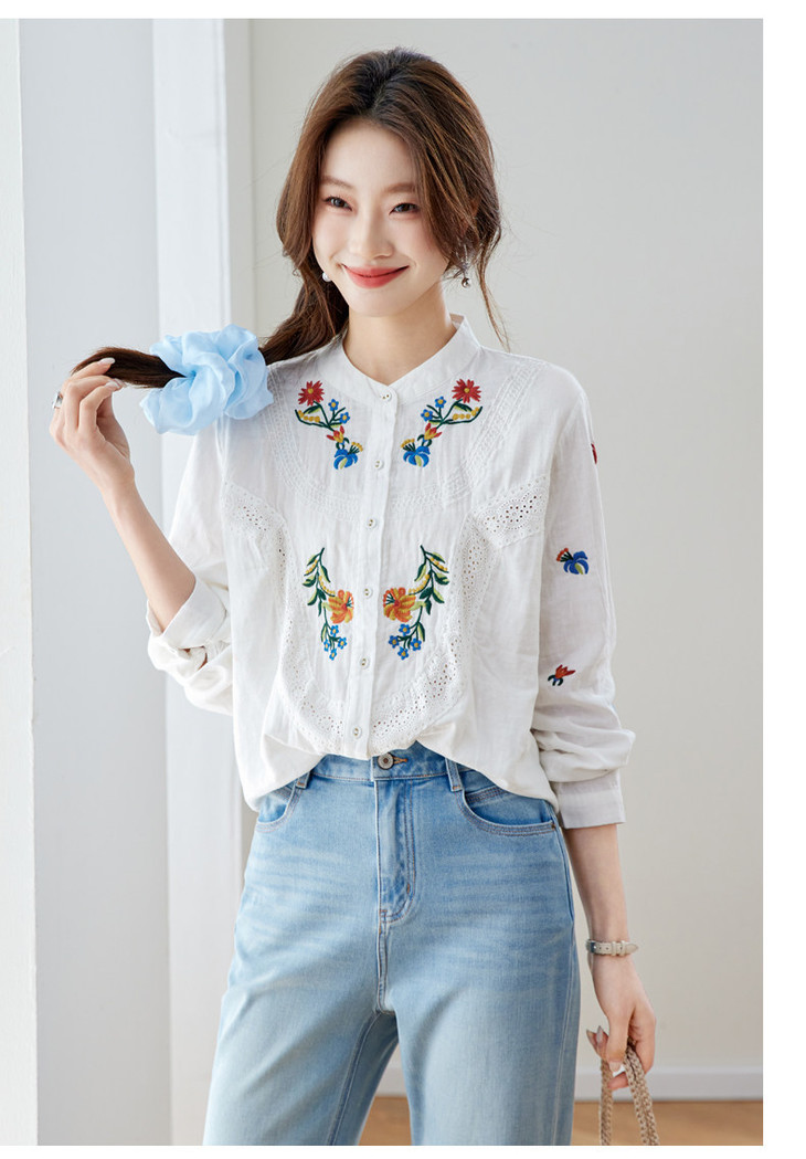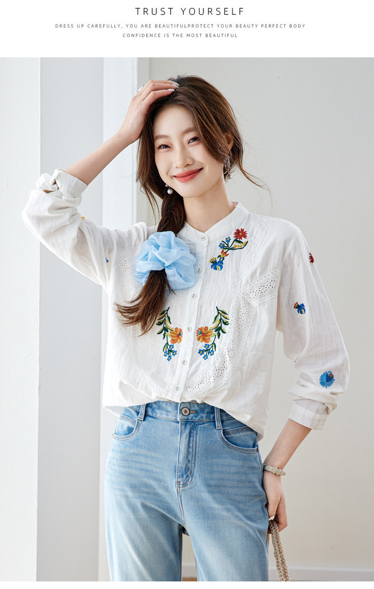 刺绣长袖全棉衬衫,轻奢减龄好看镂空立领上衣CC6223