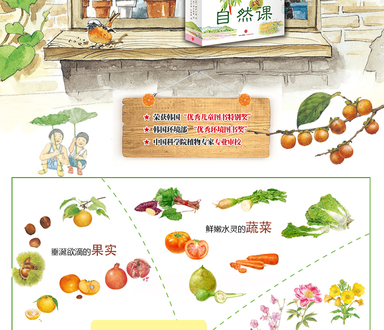 《我家门外的自然课》是写给3-12岁儿童的自然图鉴绘本,分册名分别是《路边的野花》《庭院里的花》《美味的果实》《田间的蔬菜》。