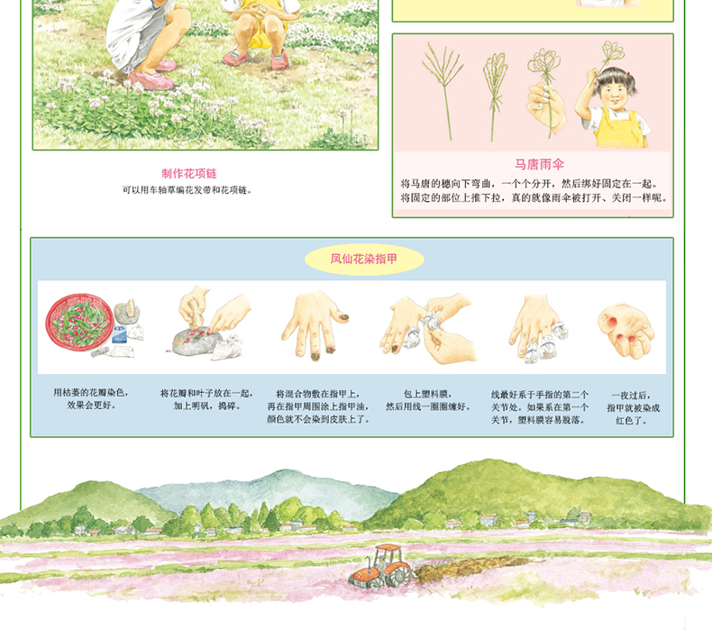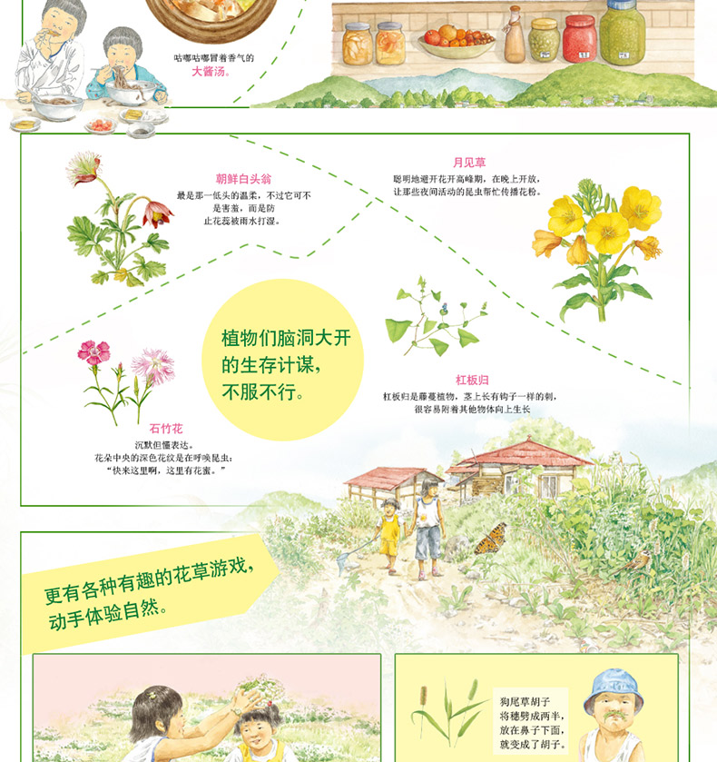 这套书介绍了孩子们在家门口就能看到的植物,,你可以认识有上千颗种子的狗尾草,学到100多种蔬菜的美味吃法,用凤仙花染出纯天然的指甲,体验摘桑葚吃的乐趣。