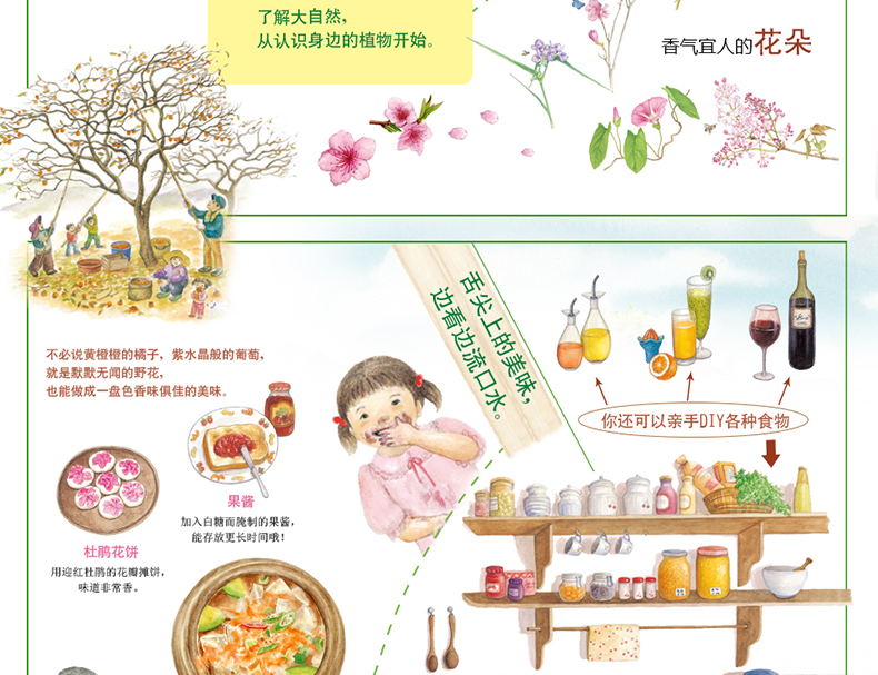 每种植物作者都配有细腻逼真的水粉插画,让你似乎闻到了花的香味,想吃到让人垂涎欲滴的果实,咬一口脆生生的蔬菜。