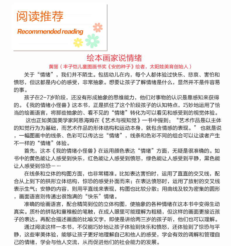 故事的结尾,小怪兽变成了粉红色,这又是哪一种情 绪呢?线条分明的简笔画,明快温暖的涂鸦颜色,直 观的3D立体场景,童真质朴的绘本语言,把抽象的情 绪概念,变幻成呆萌可爱的情绪小怪兽,告诉孩子什 么是快乐、忧伤、愤怒……教会孩子做真实的自己。