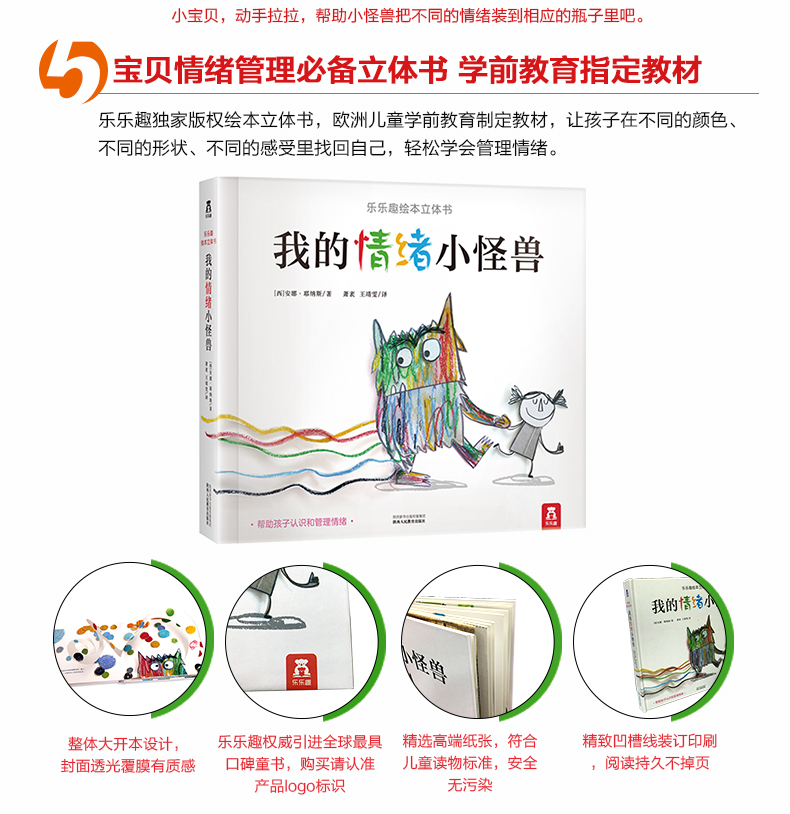安娜·耶纳斯著的《我的情绪小怪兽》是一本大人和小孩值得拥有的情绪管理绘本立体书! 情绪是什么?看不见摸不着吗?不,情绪是一只有各种颜色的小怪兽。它快乐时想笑,忧伤时想哭,生气时像一只燃烧的小火球……书中精心设计的立体场景和线条,简洁、质朴的拼贴和童稚般的笔触,准确的绘本语言,吸引孩子阅读,教孩子轻松认知和控制情绪。