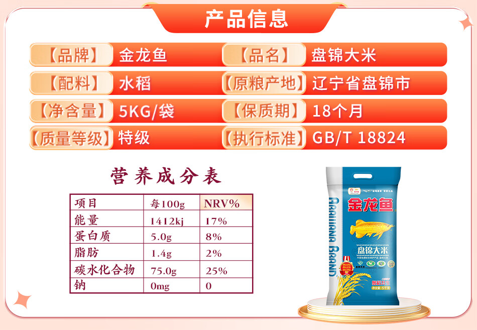 金龙鱼 东北大米 盘锦大米 5kg 蟹稻共生 蟹田大米 现磨现售