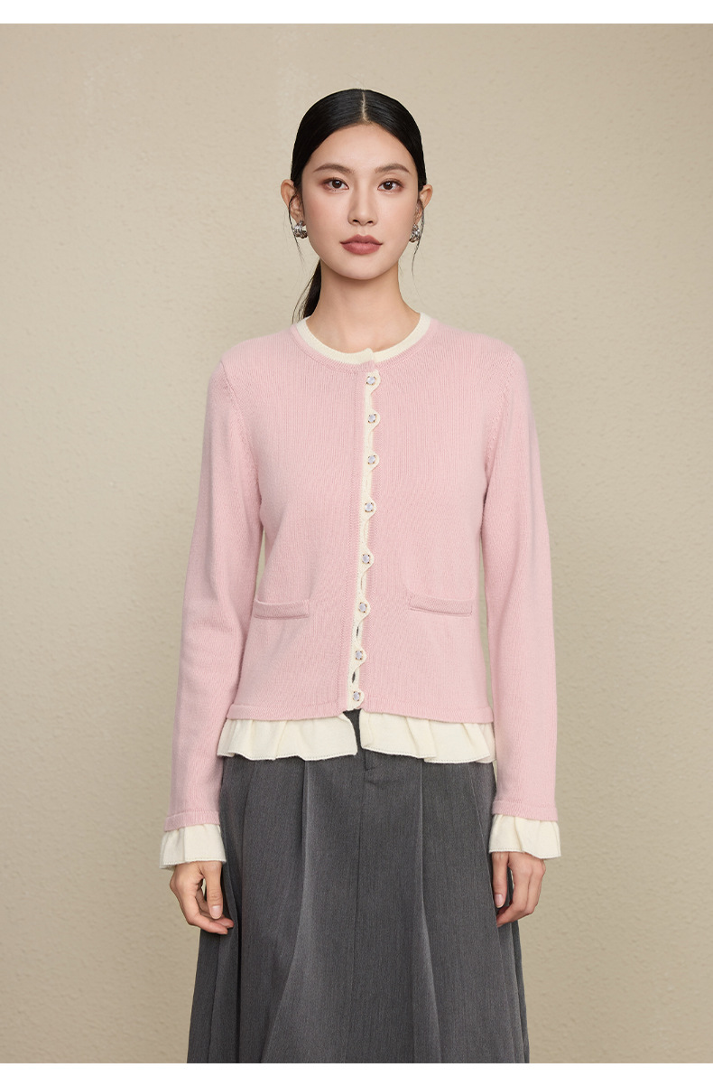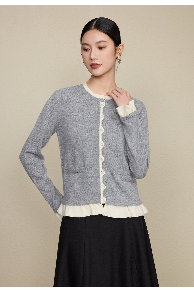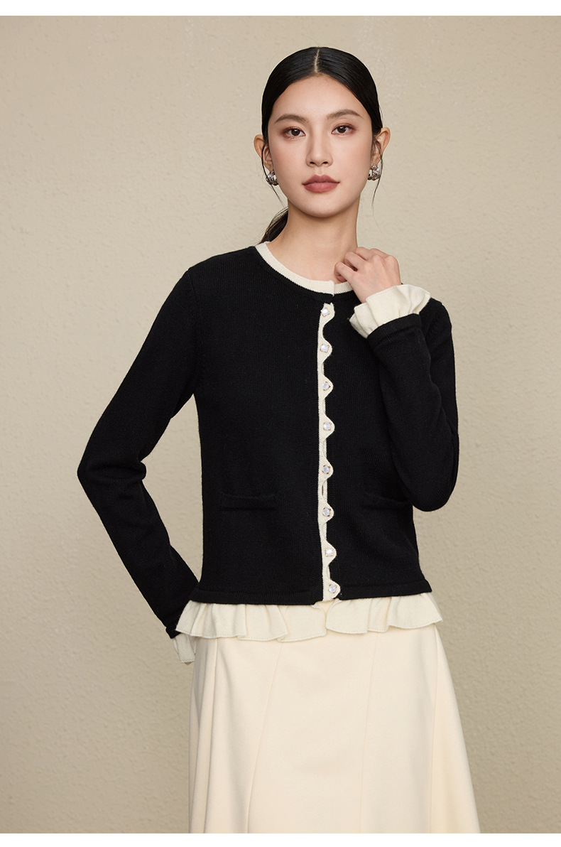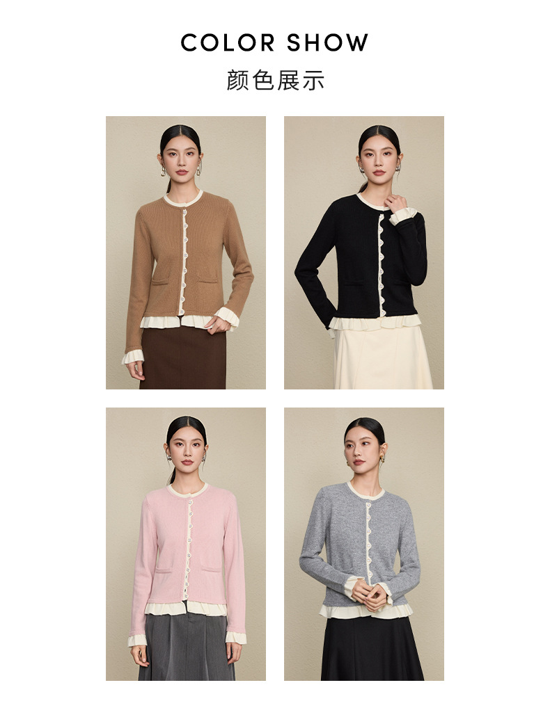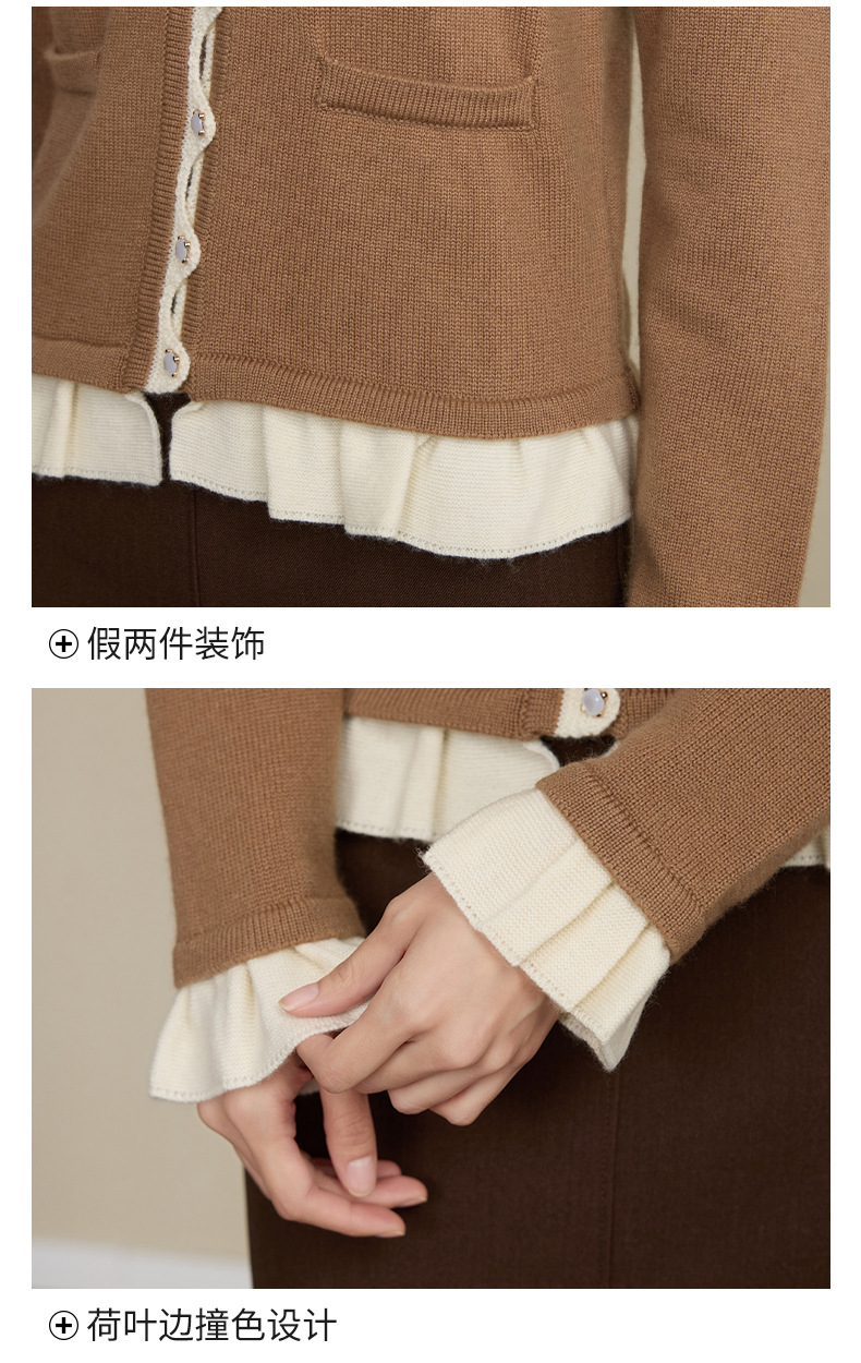 「自」全新升级【铂金会员349/天猫469/差价120】(05533)洛诗琳假两件小香风羊毛衫2025秋季荷叶边拼接圆领针织外套