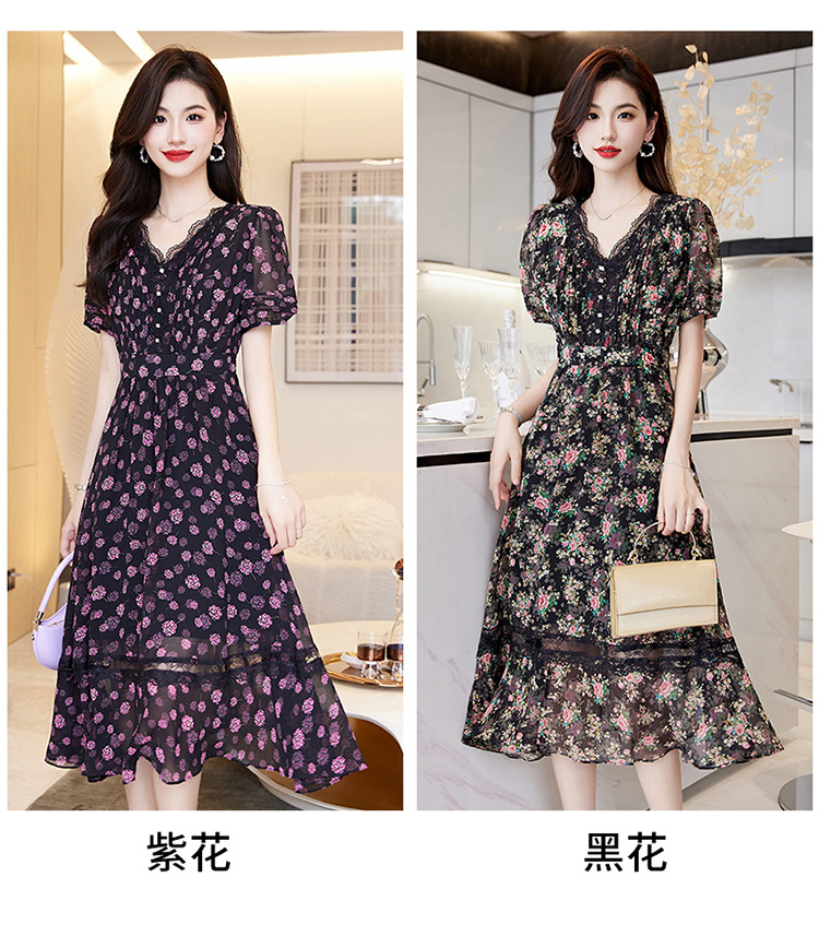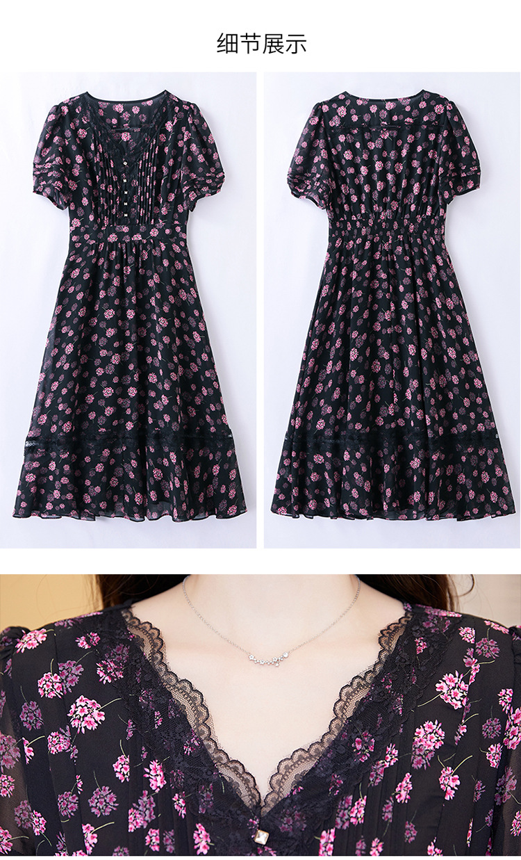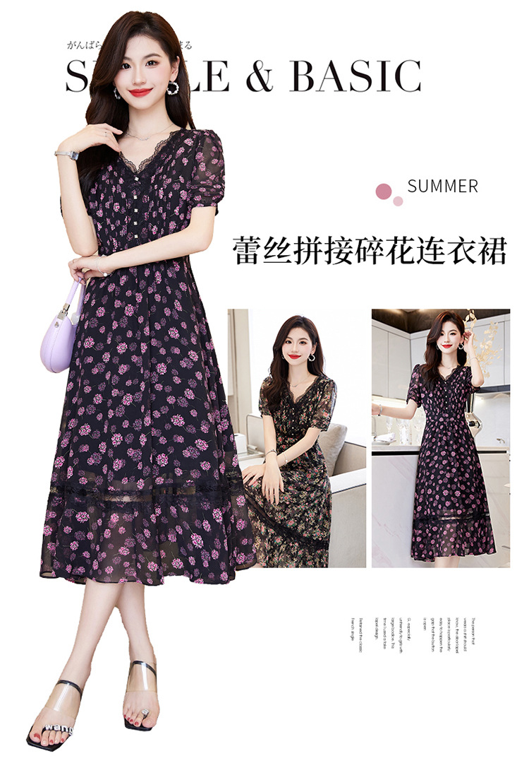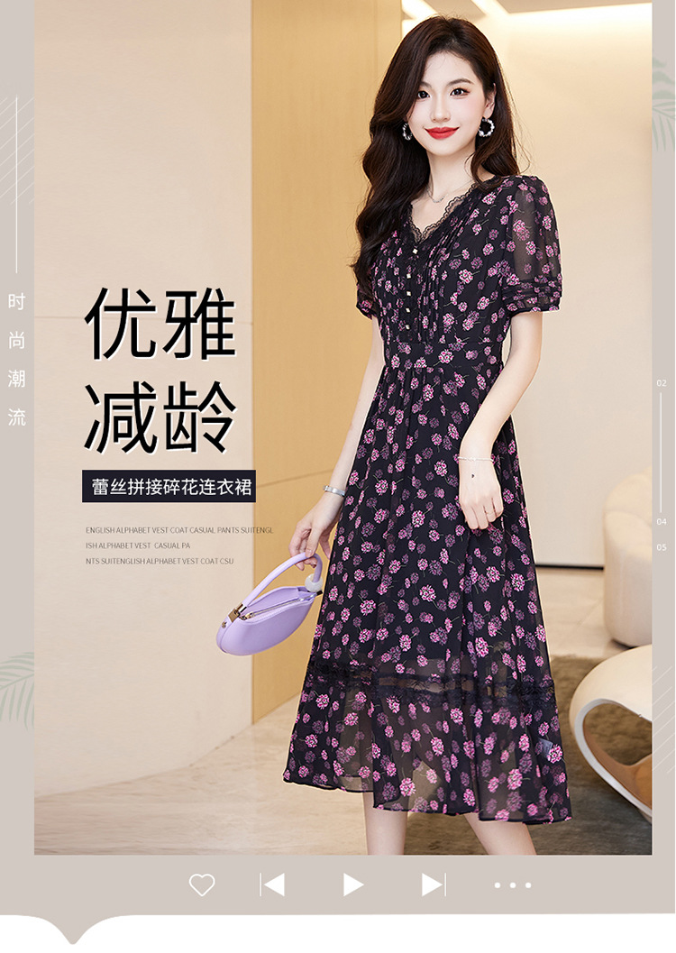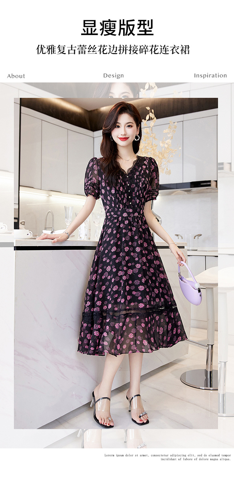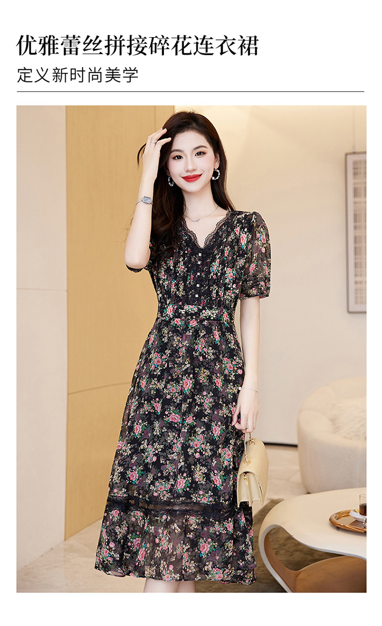 蕾丝拼接碎花连衣裙,气质V领时尚优雅减龄高腰A字裙子HR-SSQJRA650