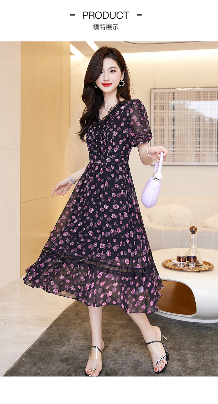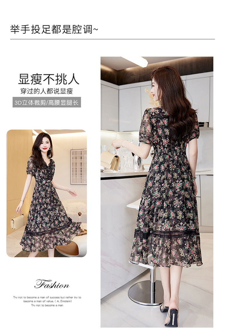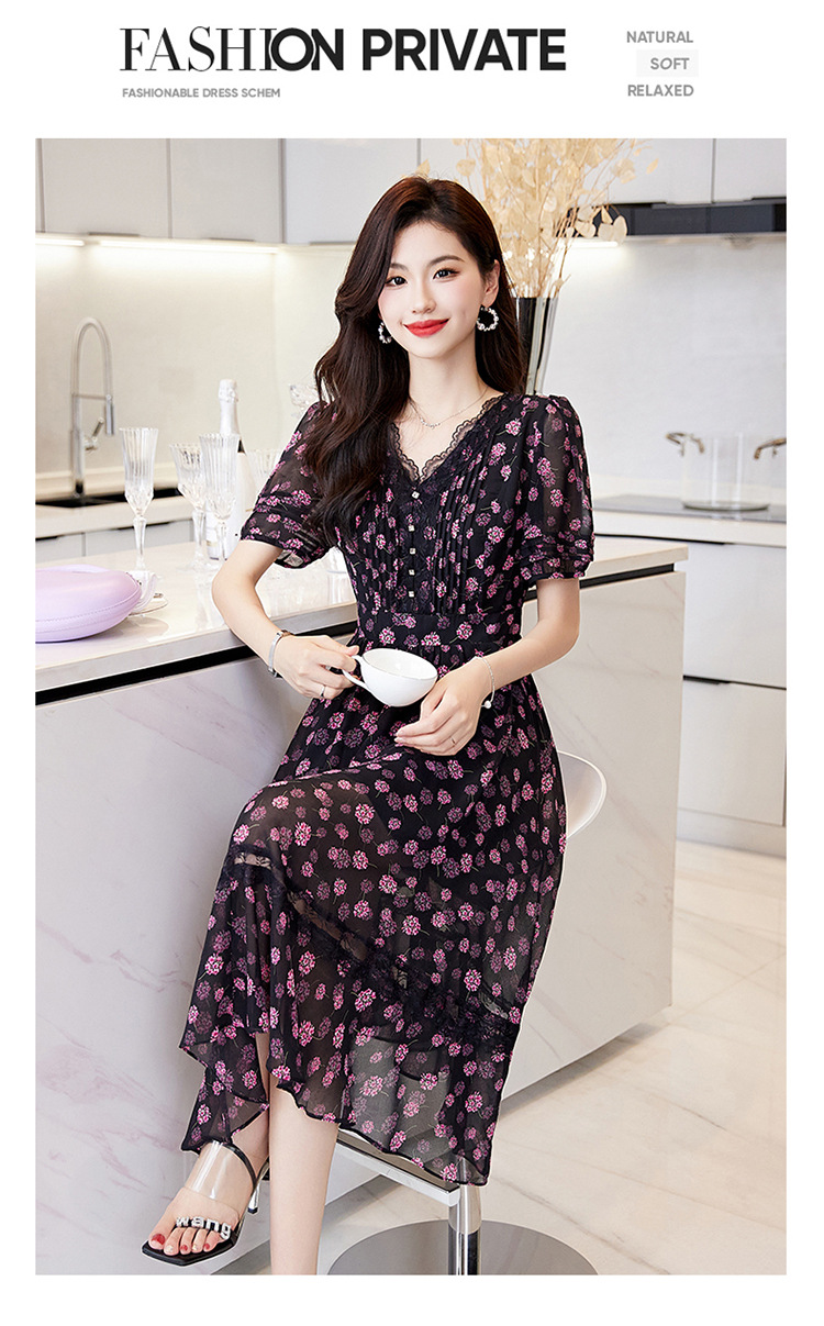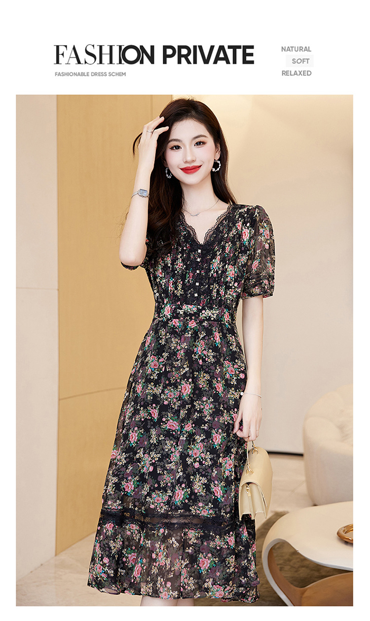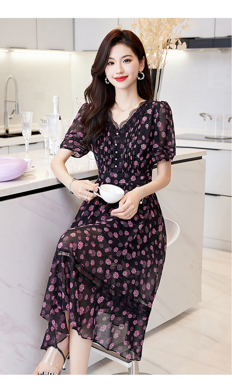 蕾丝拼接碎花连衣裙,气质V领时尚优雅减龄高腰A字裙子HR-SSQJRA650