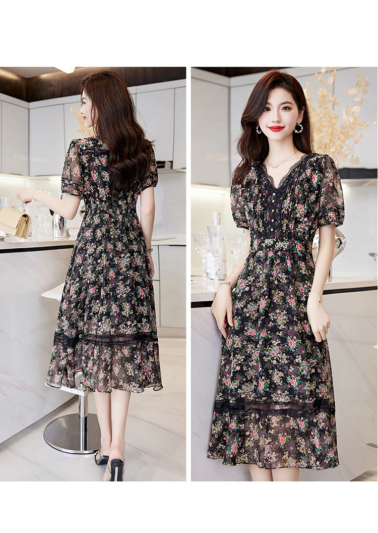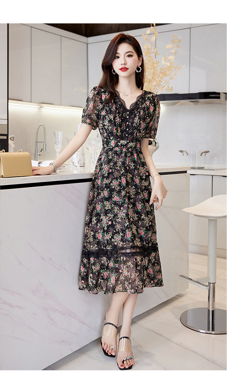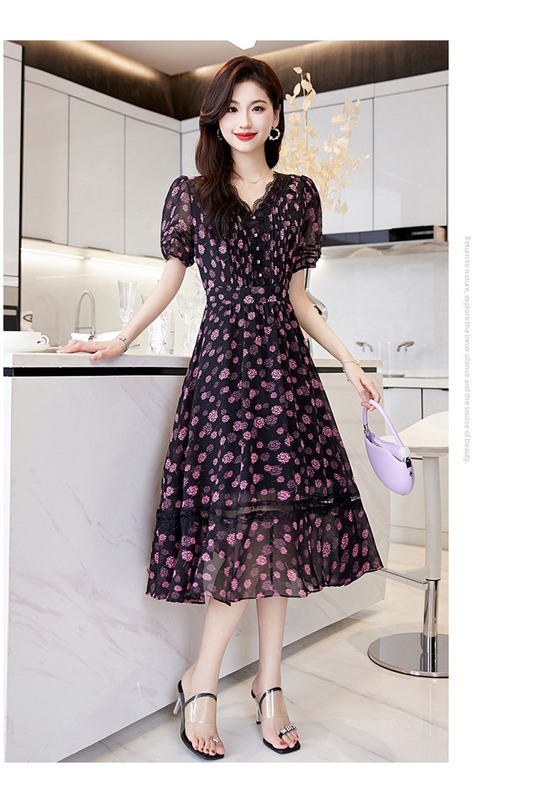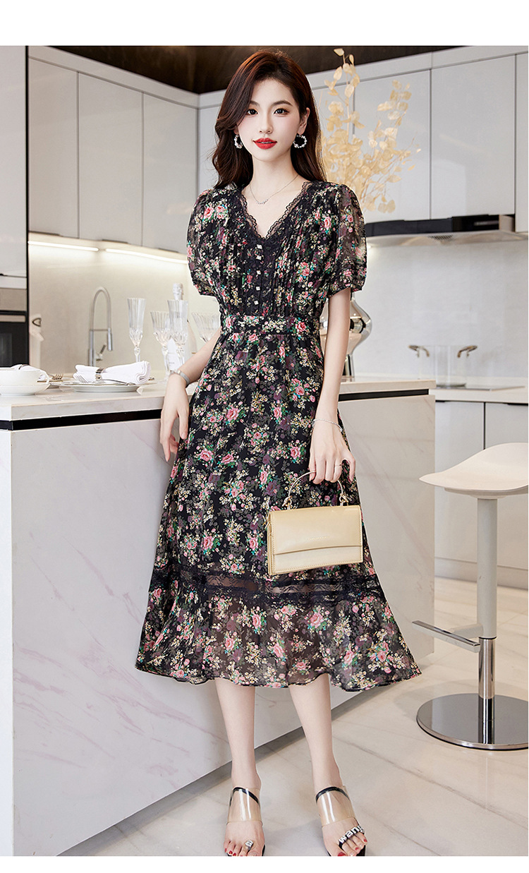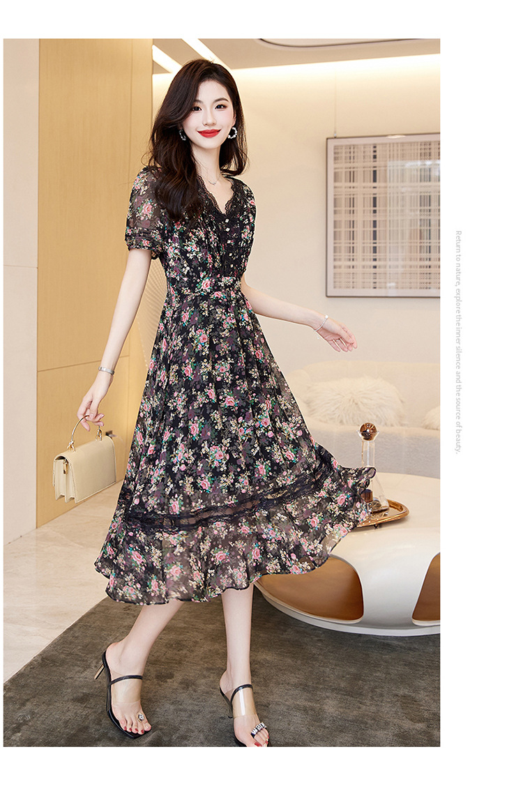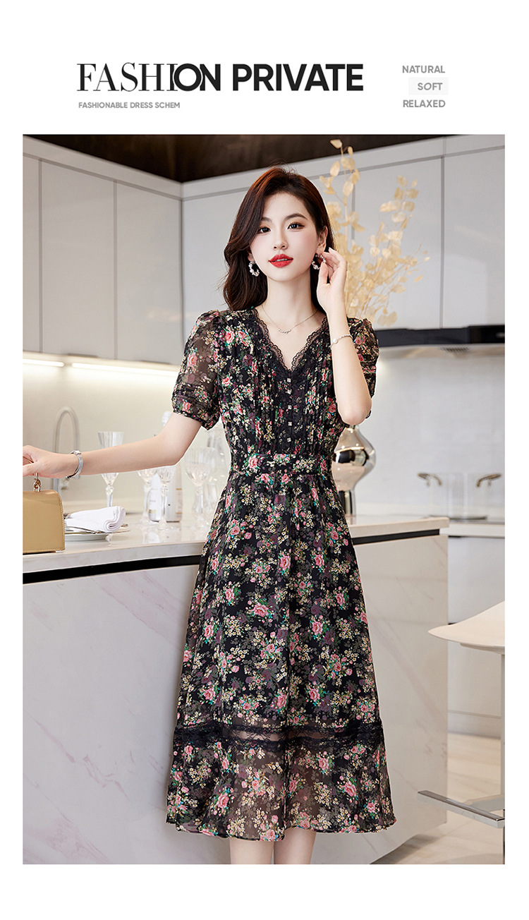 蕾丝拼接碎花连衣裙,气质V领时尚优雅减龄高腰A字裙子HR-SSQJRA650