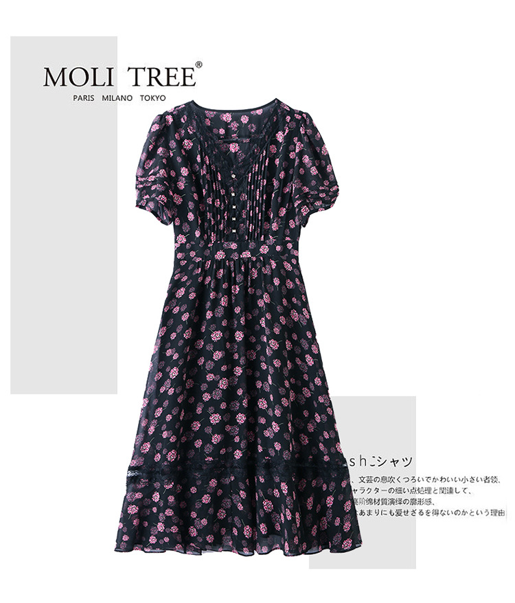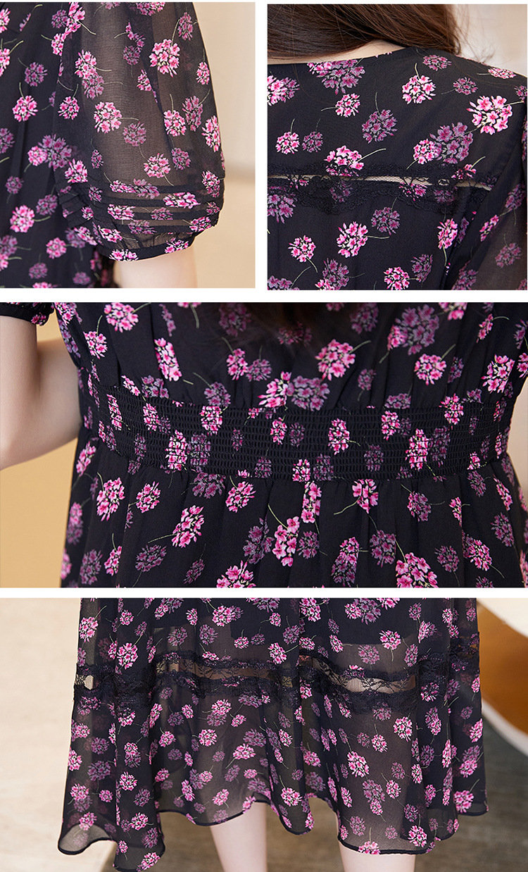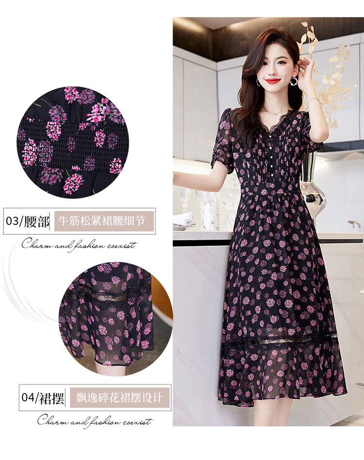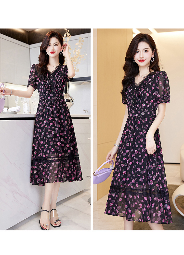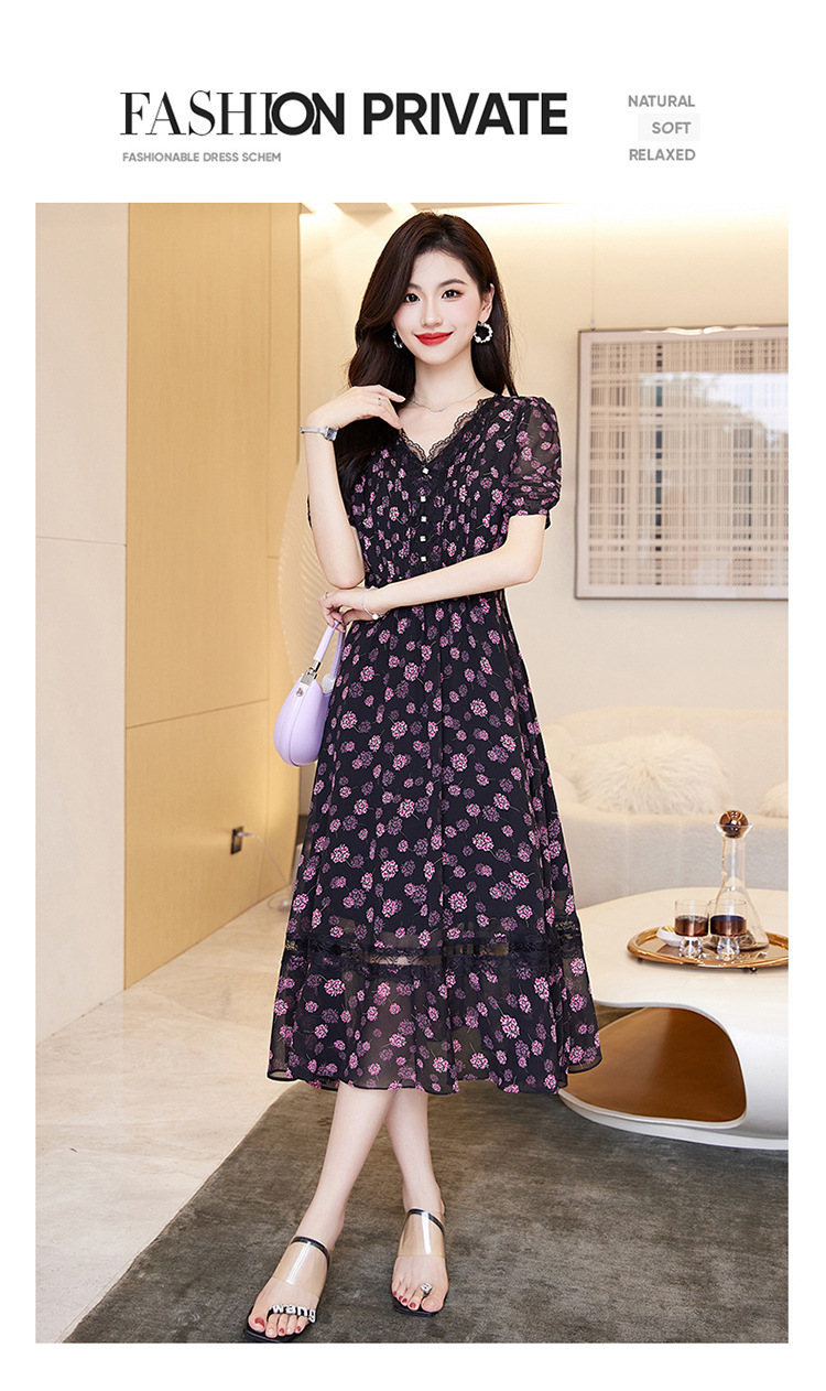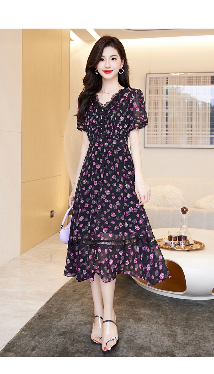 蕾丝拼接碎花连衣裙,气质V领时尚优雅减龄高腰A字裙子HR-SSQJRA650