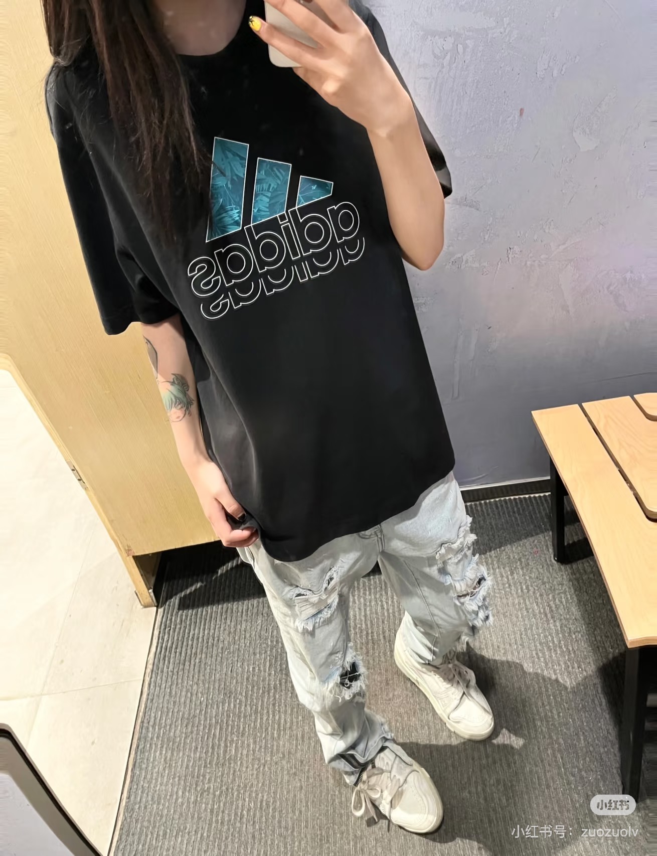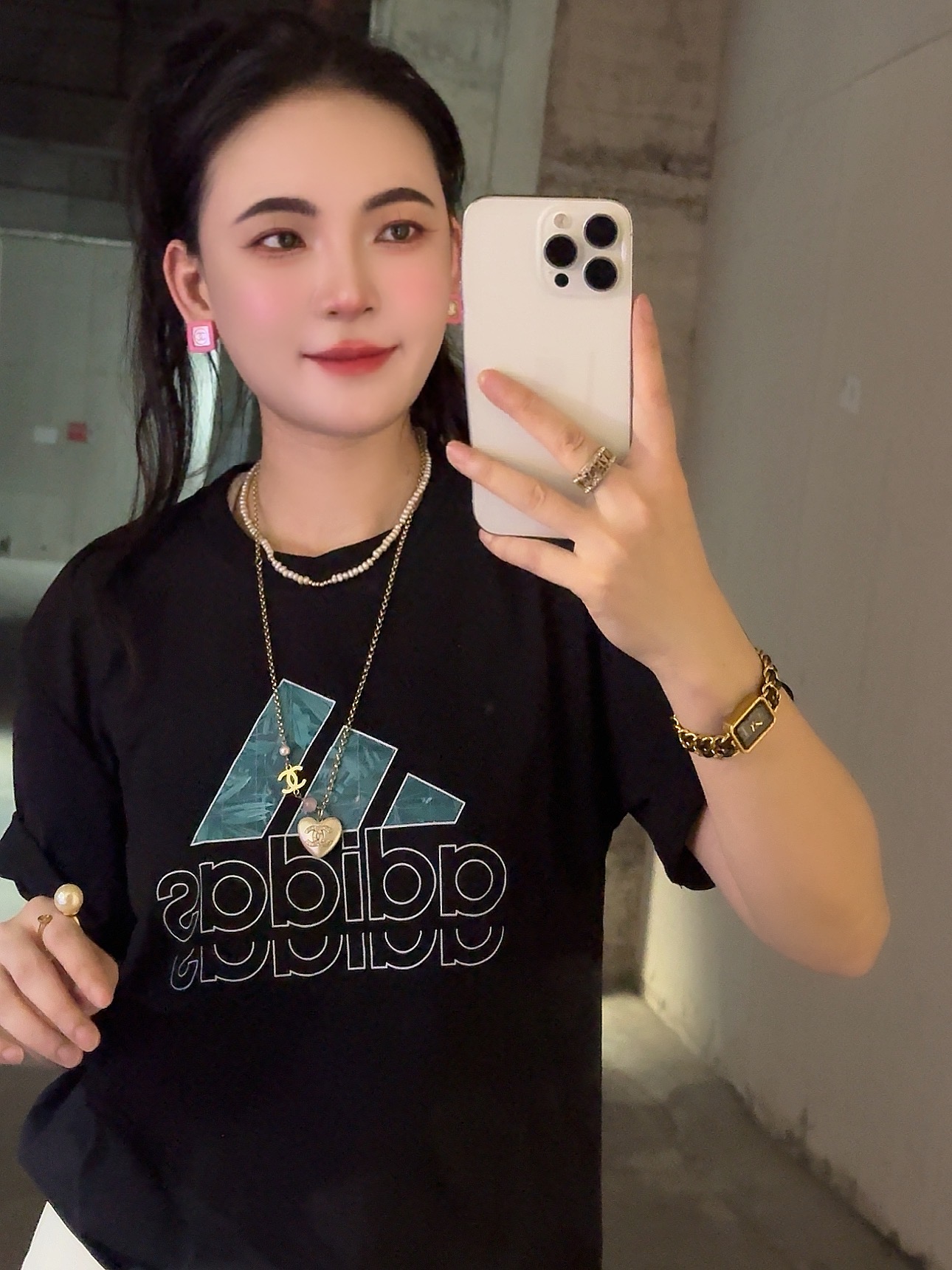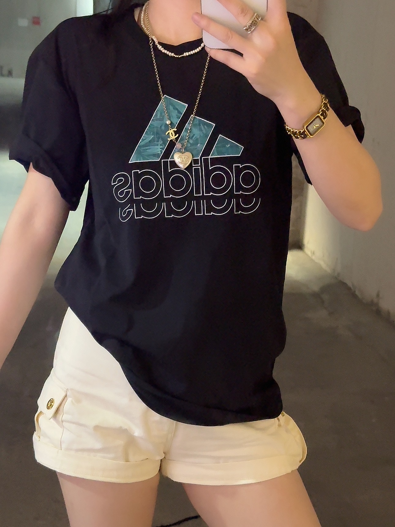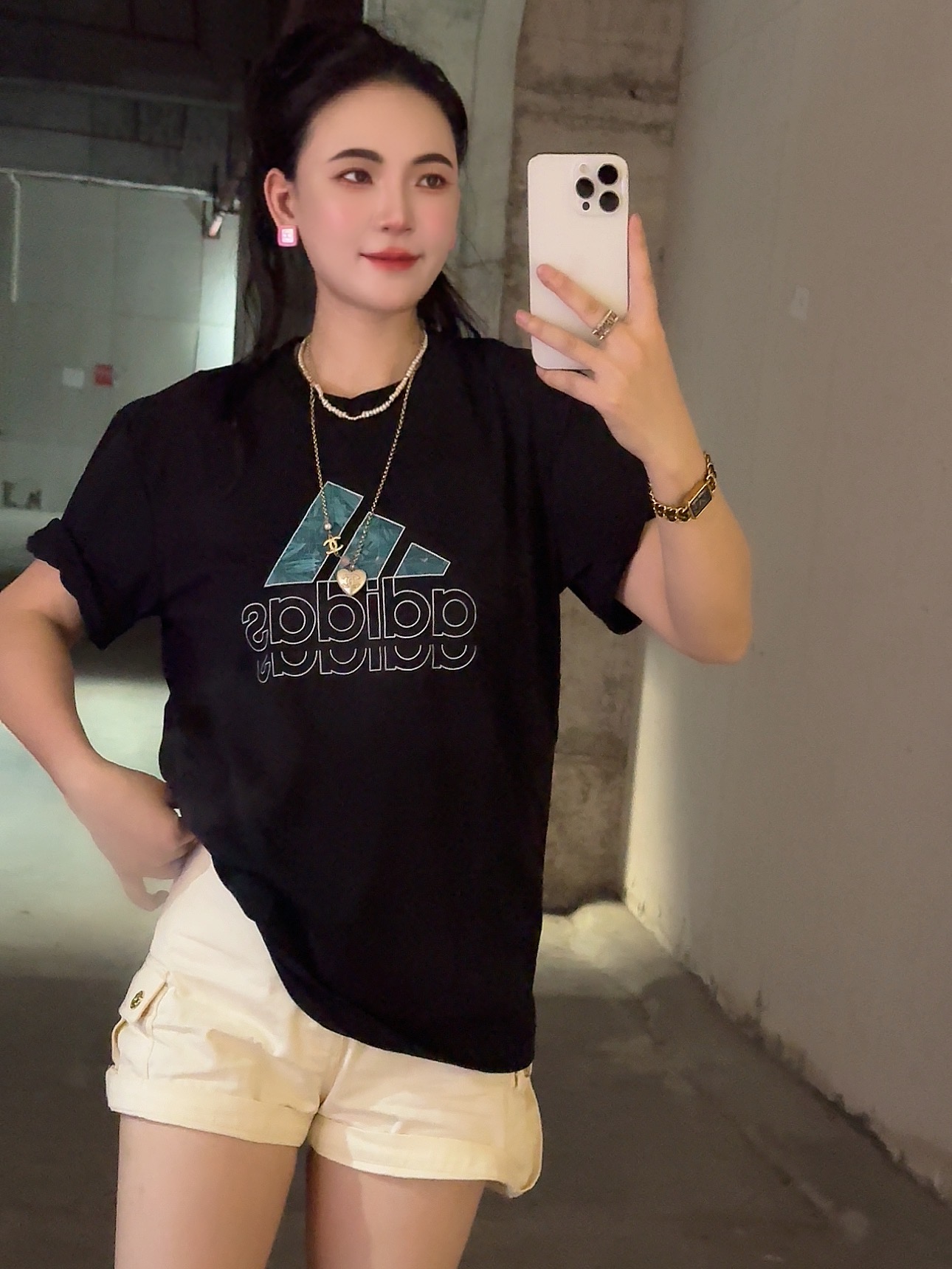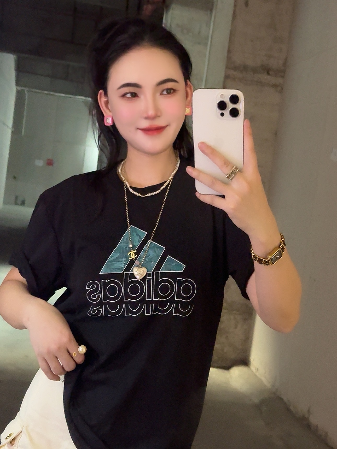 阿&迪男女同款字母logo t经典 两个颜色,纯棉材质。波哥黑色穿的L码。白色穿的XL码。蕾姐白色2XL效果 黑色M效果。图片对应上身效果。最大2XL。这款版型正常卡码往大拍。 M-140以内⚠️ L155以内 XL 170以内 2XL185以内⚠️