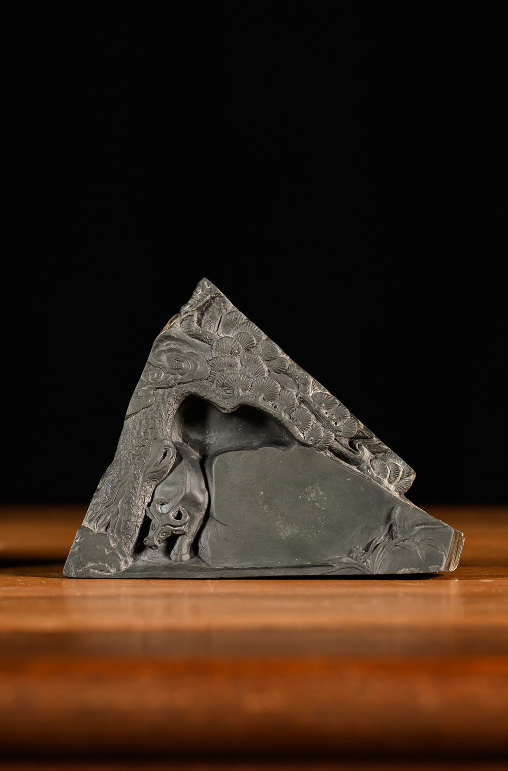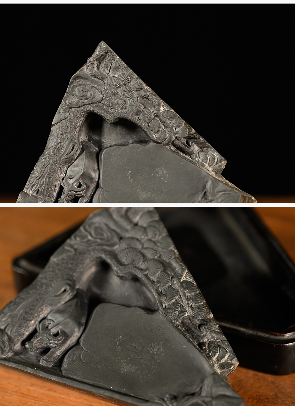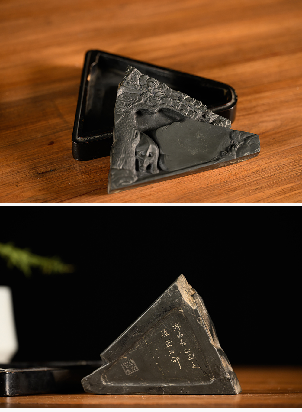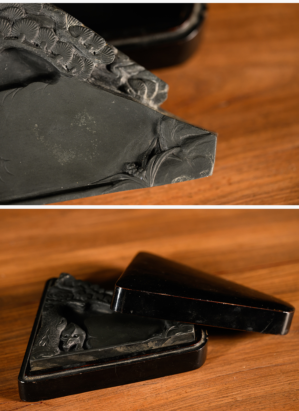 民国 松树牛纹歙砚(黑漆砚盒)