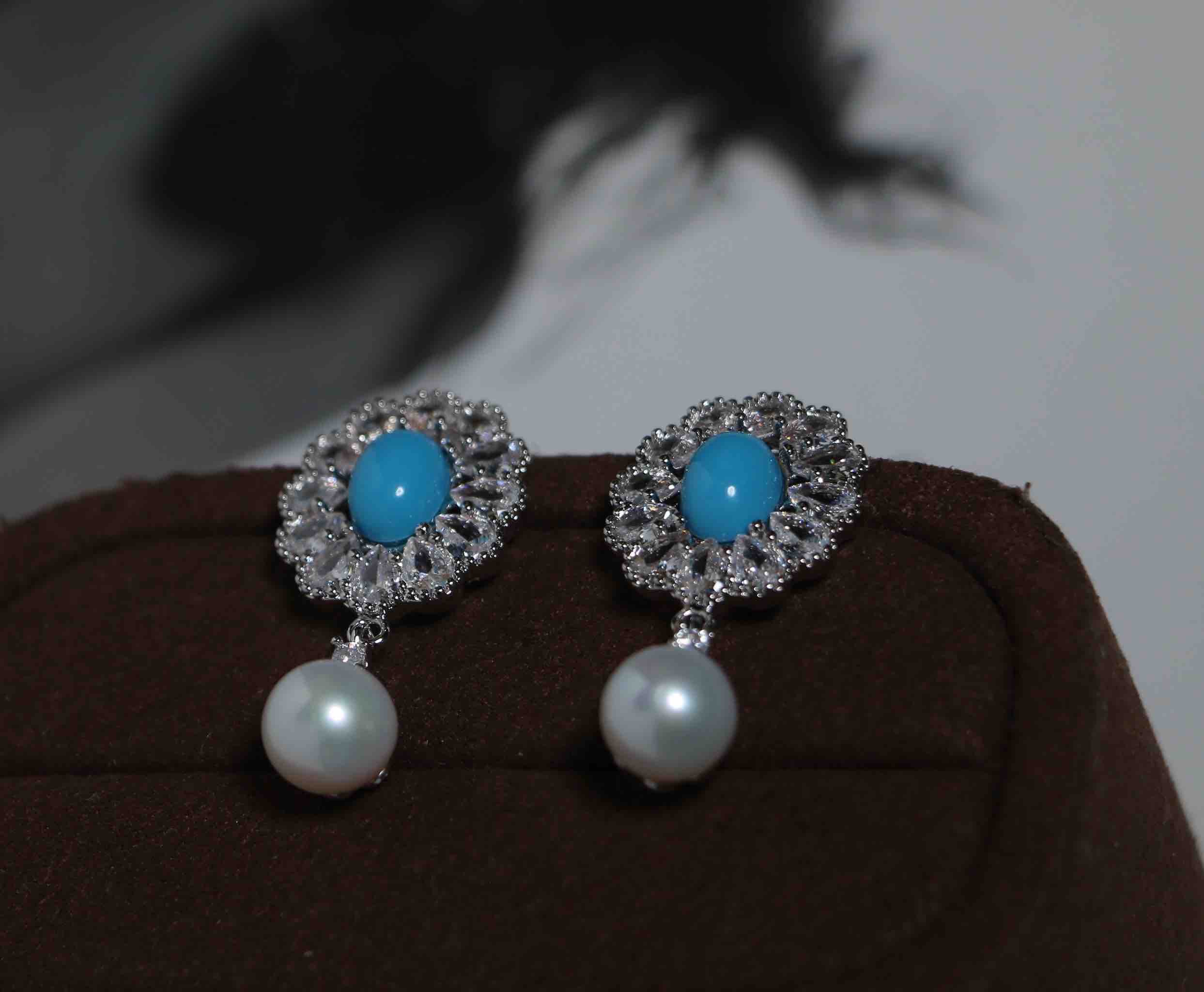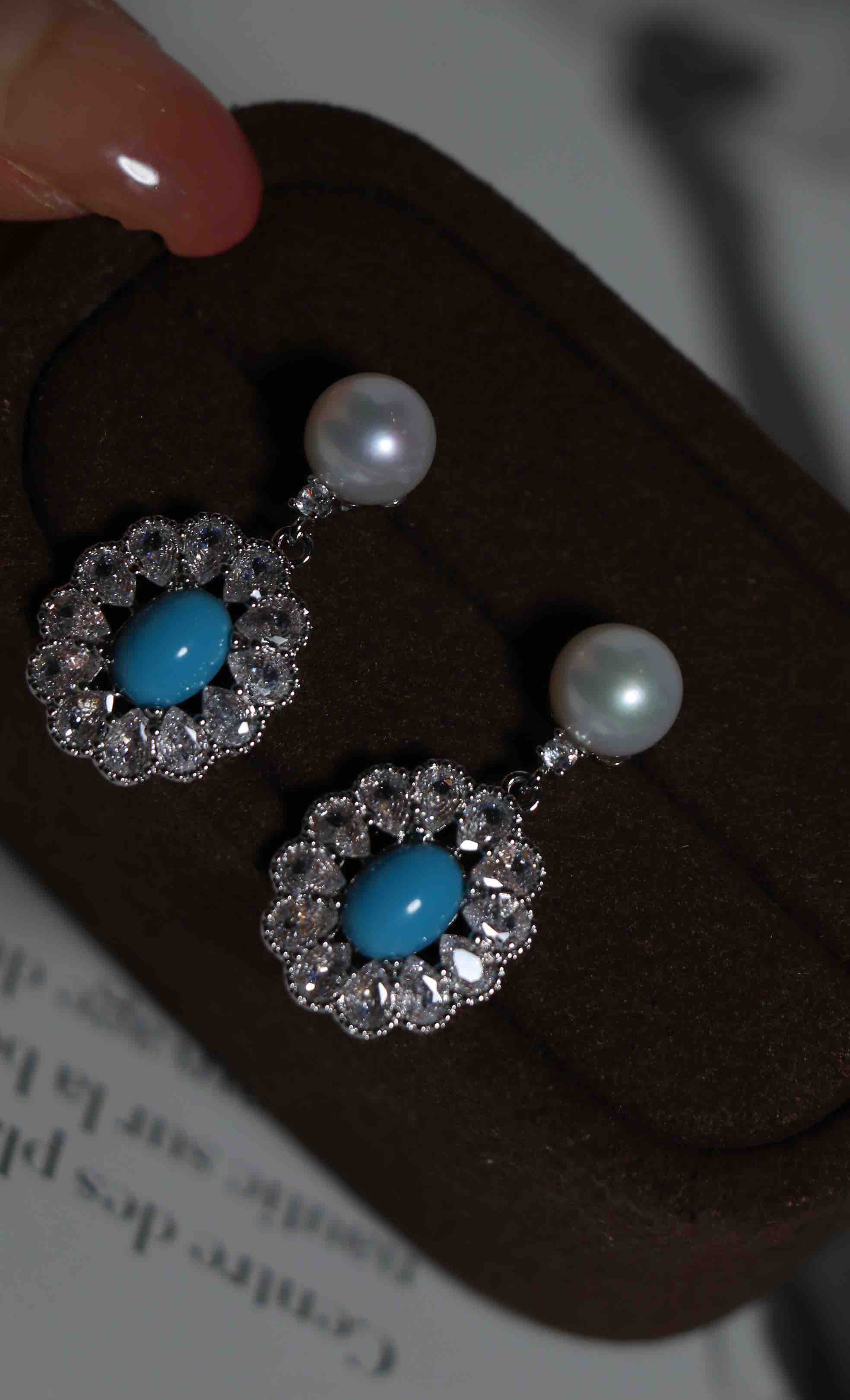 提升气色,gao版本强光完美品质淡水珍珠耳环,无暇,约7mm。配件纯银针+注金配件+人造绿松。