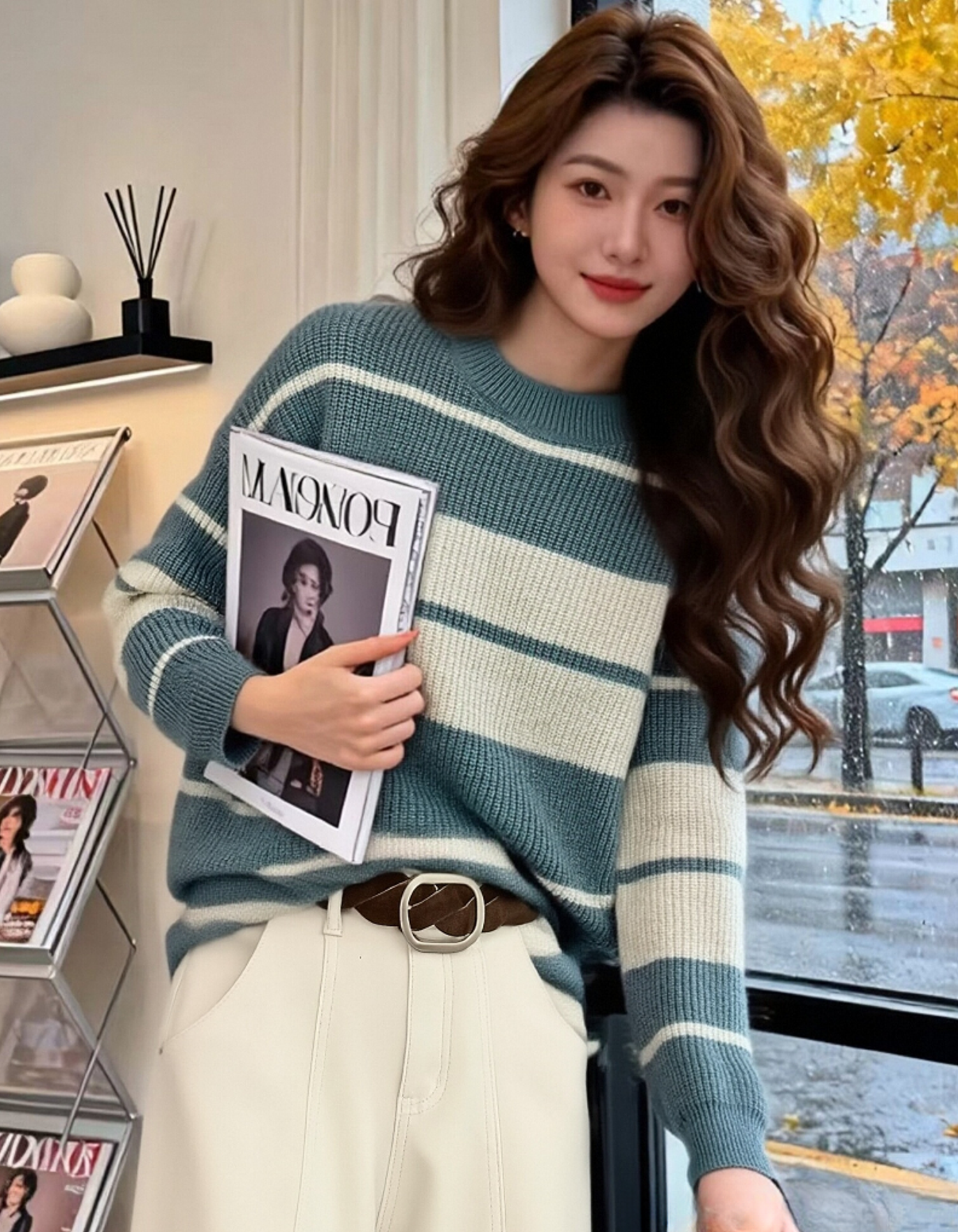 女王节抢购价-不支持退→不支持退货【自营】-【超美毛衣】花纱~Z091韩系慵懒风两色撞色条纹毛衣-喜出