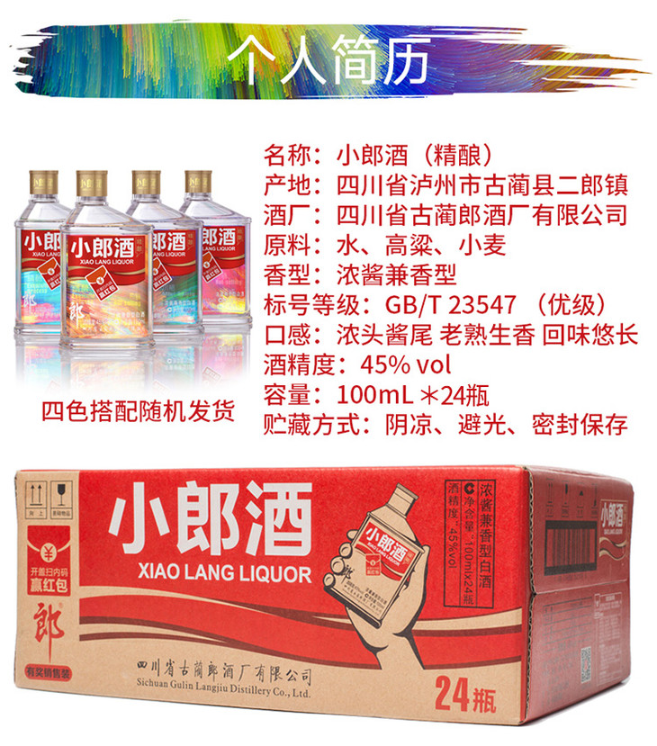 【推荐】郎酒 小郎酒 炫彩小瓶 45度 100ml*24 整箱装 兼香型白酒(新老包装随机发)