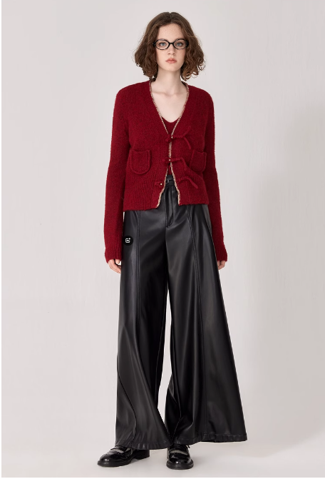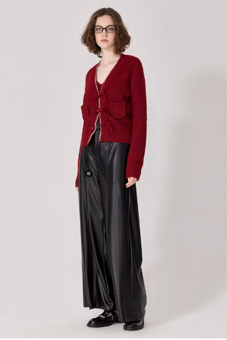 D63红色毛衣宽松休闲V领针织开衫(配背心)