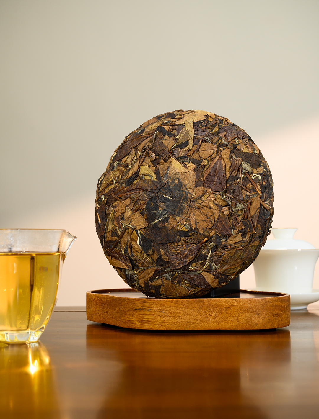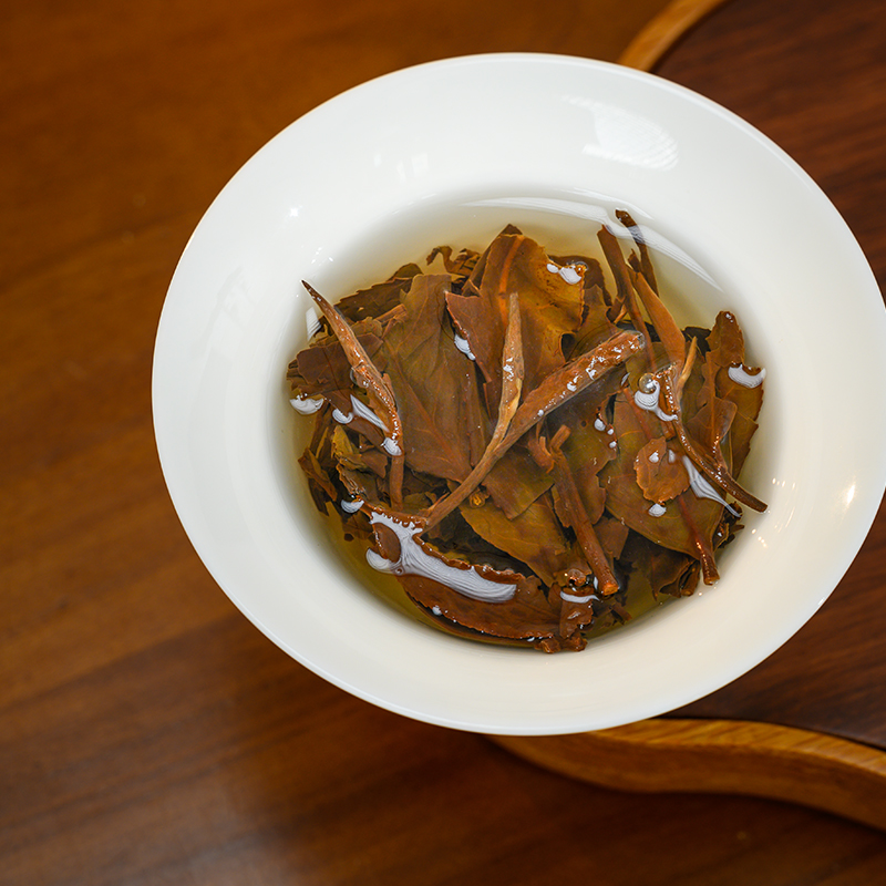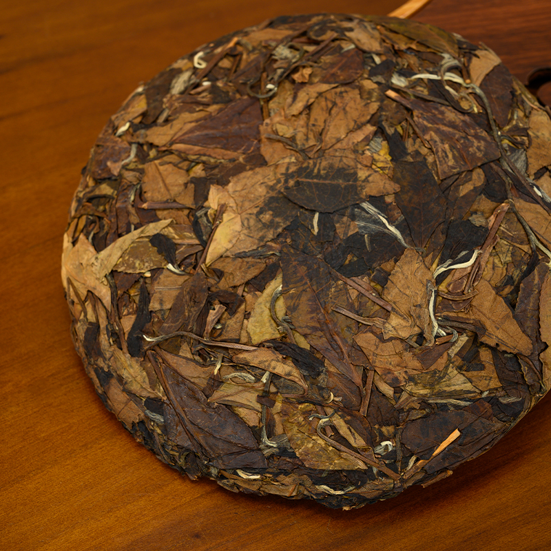 福鼎最早一批尝试压饼的产品,采用千斤顶手工压制,可以明显看出当时的工艺水平相对粗糙;原料采用磻溪高山茶,市场存量非常稀少,可以泡、可焖、可煮;经过20年的陈放,茶汤中转化出枣香、药香,茶气足;是一款教科书级别的老白茶。