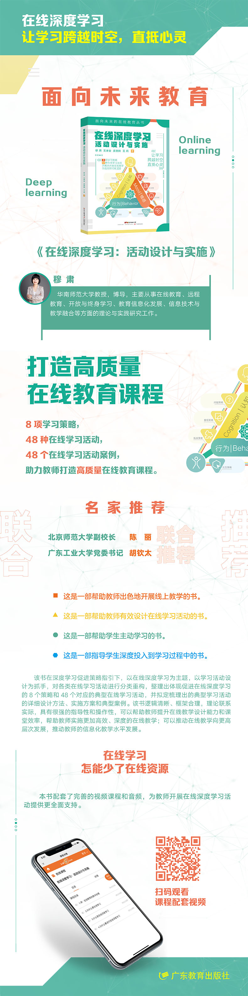 该书在深度学习促进策略指引下,以在线深度学习为主题,以学习活动设计为抓手,对各类在线学习活动进行分类重构,整理出体现促进在线深度学习的8个策略和48个对应的典型在线学习活动,并拟定梳理出的典型学习活动的详细设计方法、实施方案和典型案例。该书逻辑清晰、框架合理,理论联系实际,具有很强的指导性和操作性。可以帮助教师提升在线教学设计能力和课堂效率,帮助教师实施更加高效、深度的在线教学;可以推动在线教学向更高层次发展,推动教师的信息化教学水平发展。