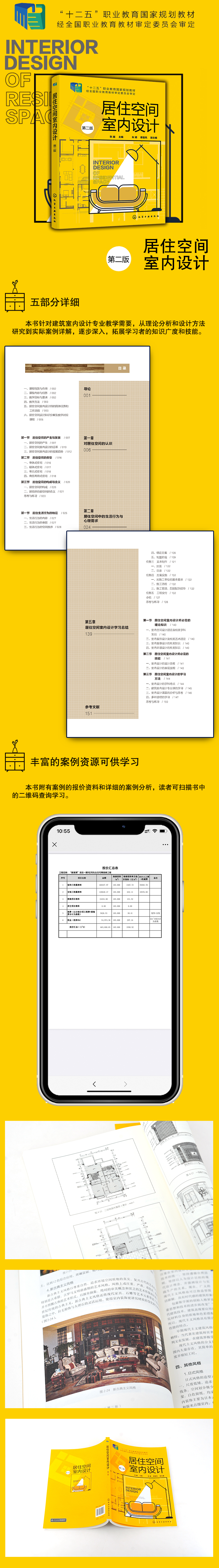 本书针对建筑室内设计专业教学需要,在课程导论的基础上,通过五部分内容,从理论分析和设计方法研究到实际案例详解,逐步深入,拓展学习者的知识广度和技能。其中,排名靠前至第三章涵盖了居住空间的类型与构成、居住空间中的生活行为与心理需求、居住空间的功能设计等内容;第四章在明确居住空间室内设计要点的基础上,结合真实项目案例详细解析,让学习者切实体验室内设计师的工作过程,掌握工作内容及方法;第五章对居住空间室内设计的知识、技能、学习方法进行总结与提升。本书附有案例的报价资料和详细的案例分析,读者可扫描书中的二维码查询学习。