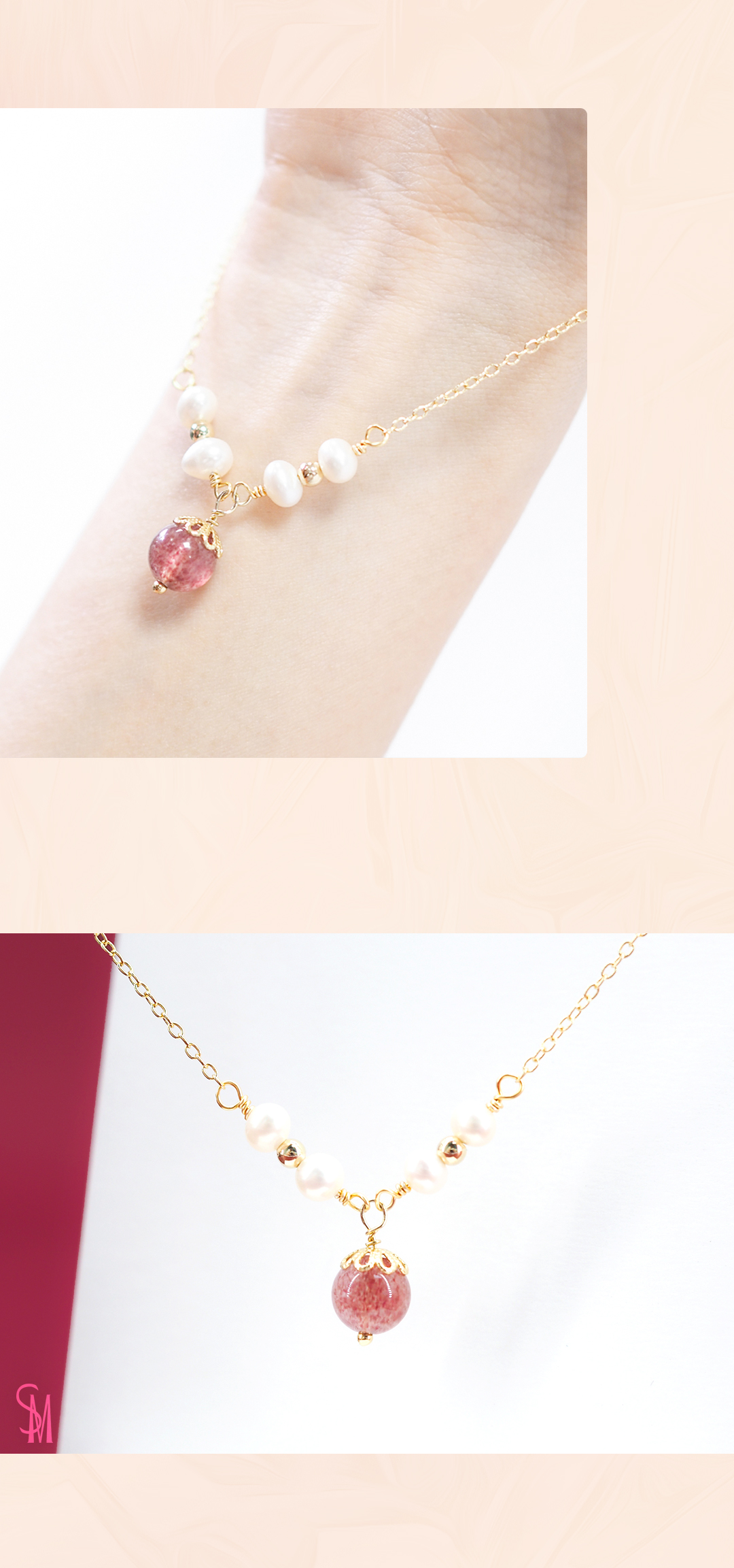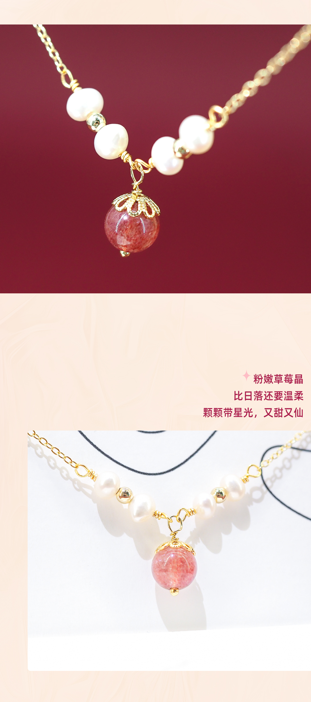 2、本项链为单颗珠体8mm的天然草莓晶、淡水珍珠串成,金属部分为铜镀金,由于尺寸为手工量度,可能略有误差。