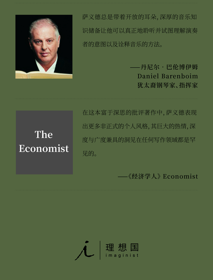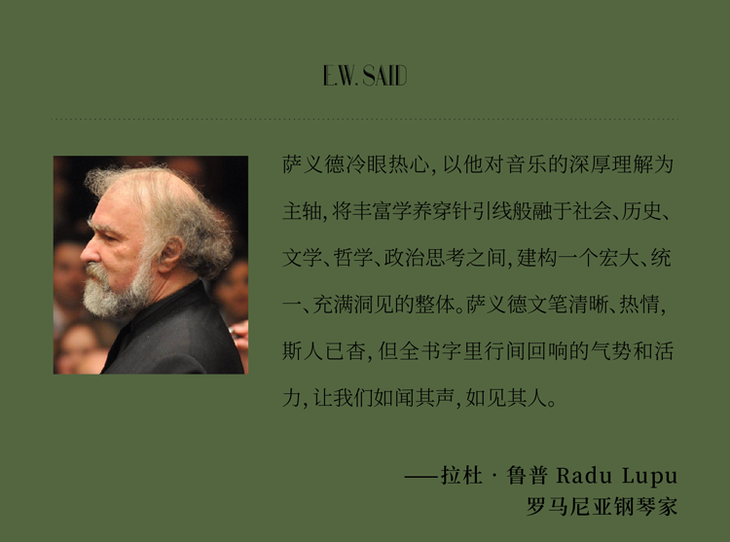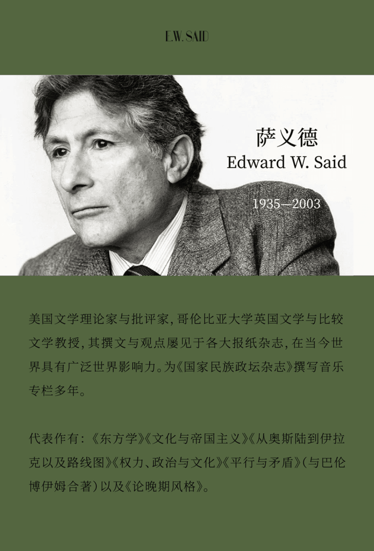 萨义德(Edward W. Said, 1935—2003),美国文学理论家与批评家,哥伦比亚大学英国文学与比较文学教授,其撰文与观点屡见于各大报纸杂志,在当今世界具有广泛世界影响力。为《国家民族政坛杂志》撰写音乐专栏多年。代表作有:《东方学》(Orientalism)《文化与帝国主义》(Culture and Imperialism)《从奥斯陆到伊拉克以及路线图》(From Oslo to Iraq and the Road Map)《权力、政治与文化》(Power, Politics, and Culture)《平行与矛盾》(Parallels and Paradoxes,与巴伦博伊姆合著)以及《论晚期风格》(On Late Style)。