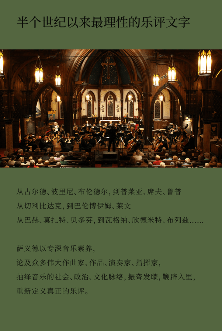 萨义德以专深音乐素养论及众多伟大作曲家、作品,伟大演奏家、指挥家,抽绎音乐的社会、政治、文化脉络,阐释音乐对社会被低估的影响力,对音乐界现状提出尖锐批评:
