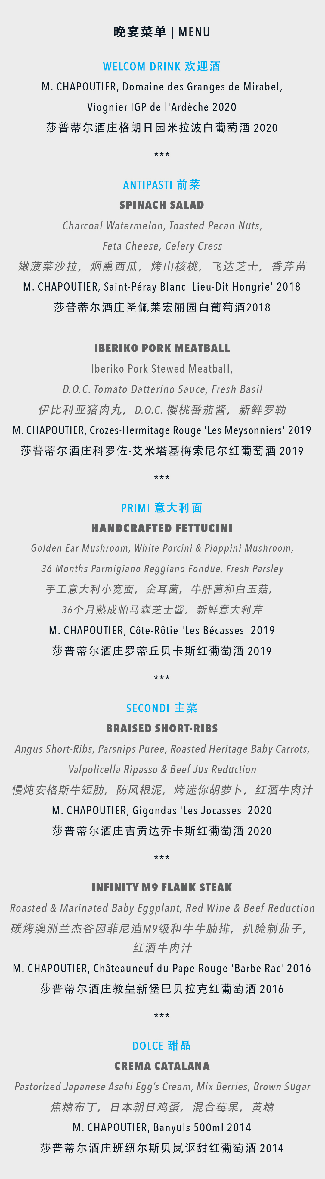 In order to make full expression of the terroir of Rhone Valley and M. Chapoutier, we specially provide six wines from the Chateau and pairing with exquisite fine dining restaurant Frasca. Let’s treat yourself during romantic Autumn. We look forward to sharing the fine wine and fine dining with you!