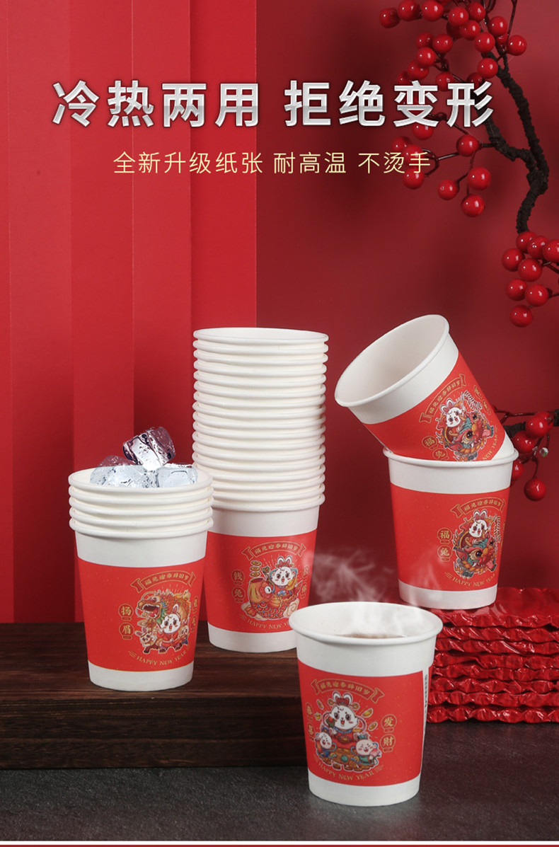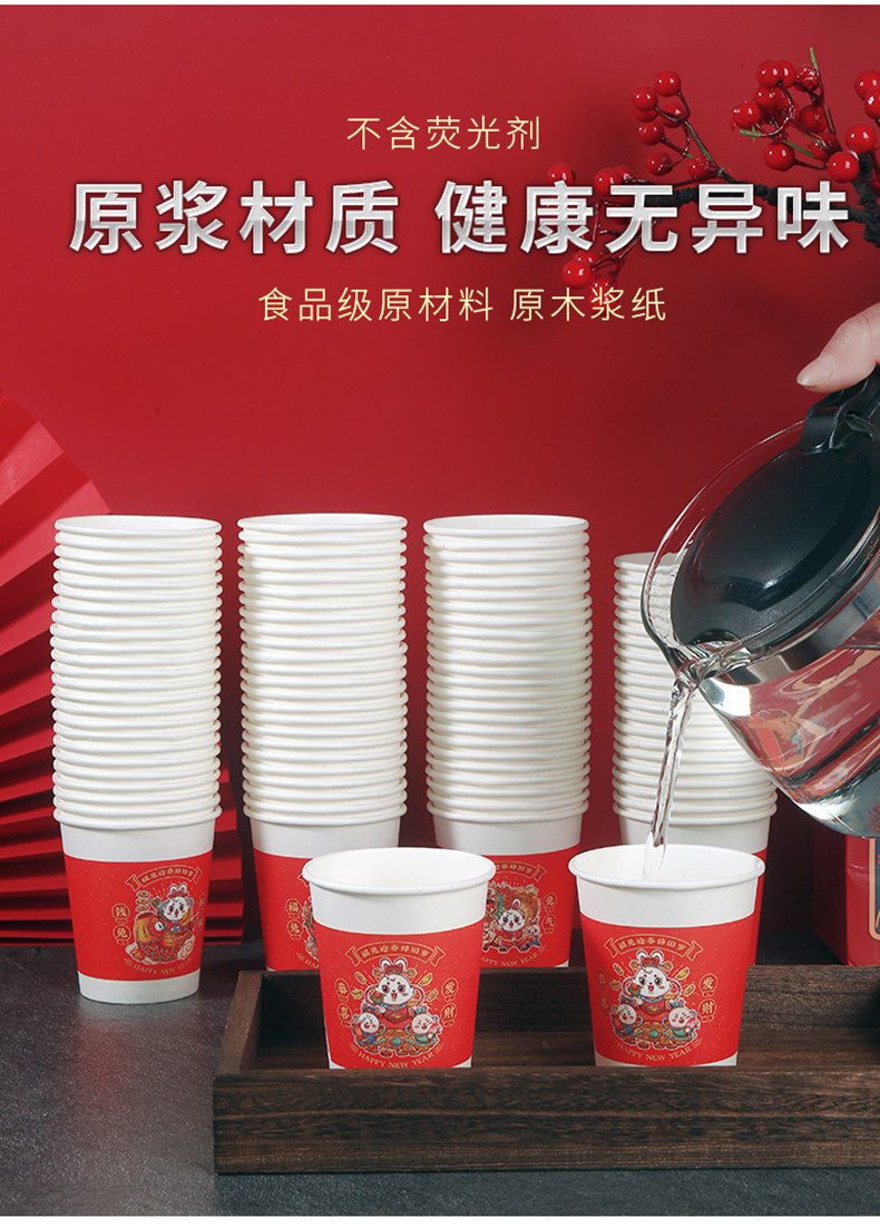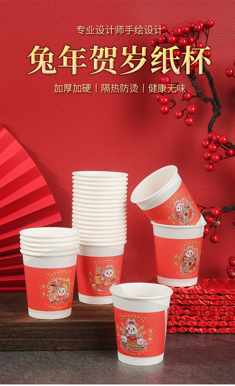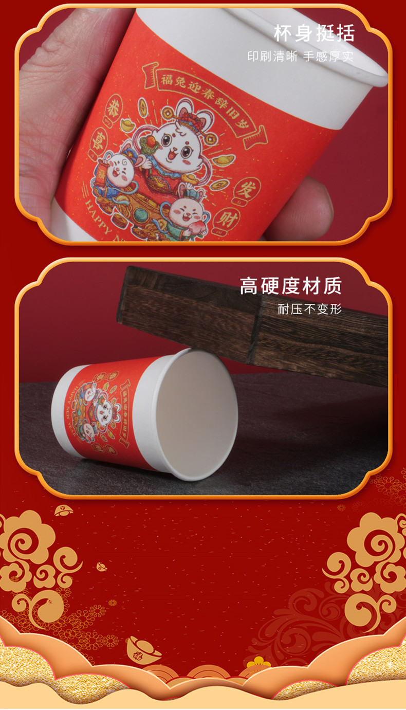 星罗年货2023兔年纸杯节日红色喜庆一次性杯子纸杯子家用加厚水杯国潮茶杯