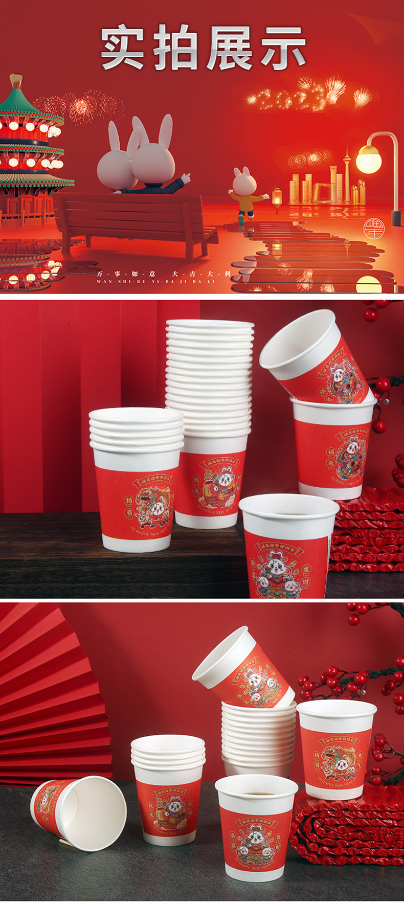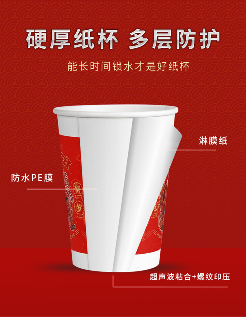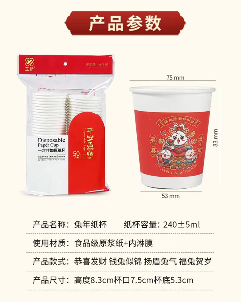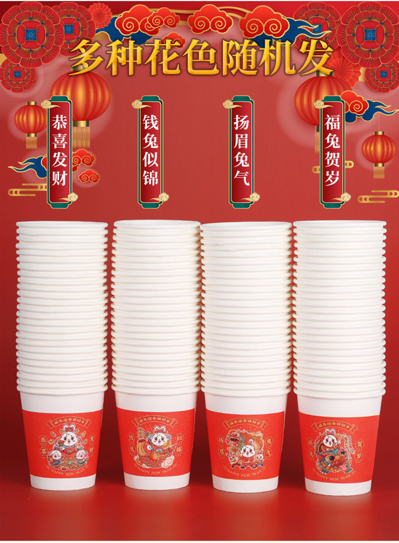 星罗年货2023兔年纸杯节日红色喜庆一次性杯子纸杯子家用加厚水杯国潮茶杯