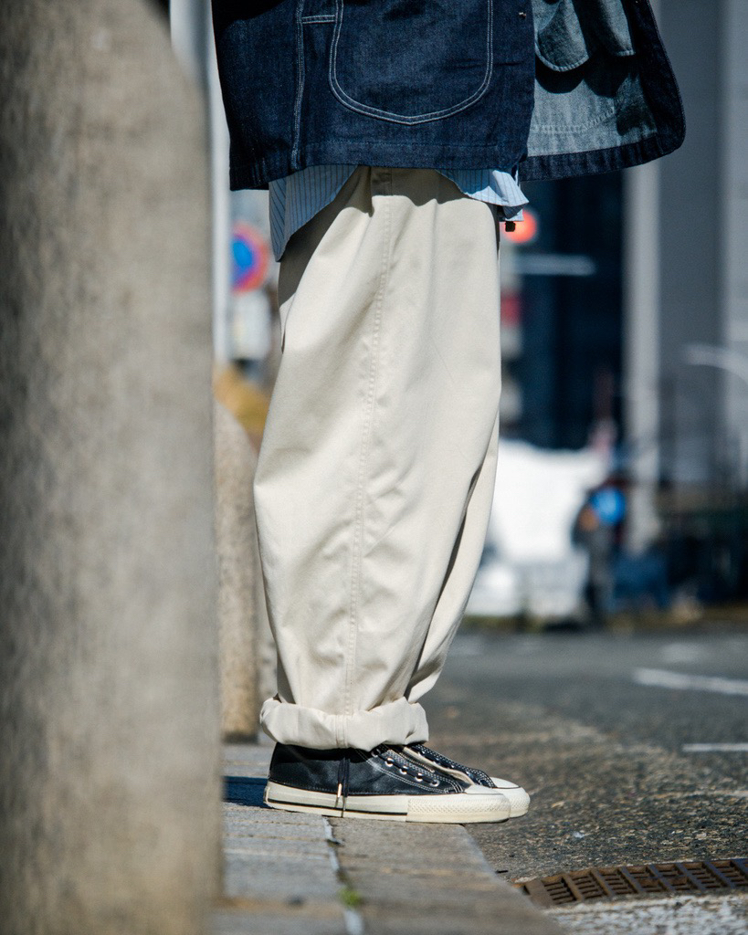 日本线最经典的锥型Chino神裤,紫标的成名之作,当年大名鼎鼎的5052/5352就是此款裤子的前身之作,紫标也是因为这个裤型才成为日潮的顶流(5052/5352/N24FC076 不同编号均是这一款裤子)好比迈巴赫22款 23款 24款一样,车没变,只是代号变了