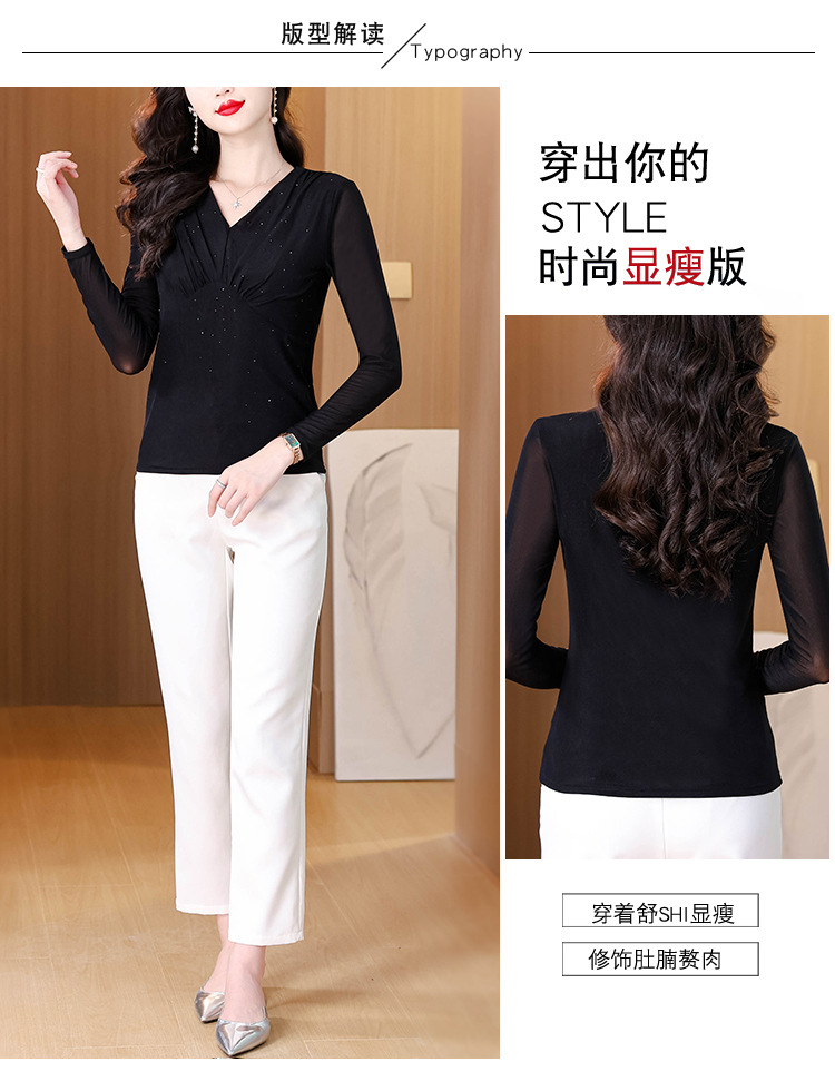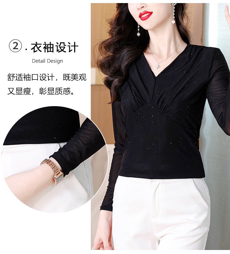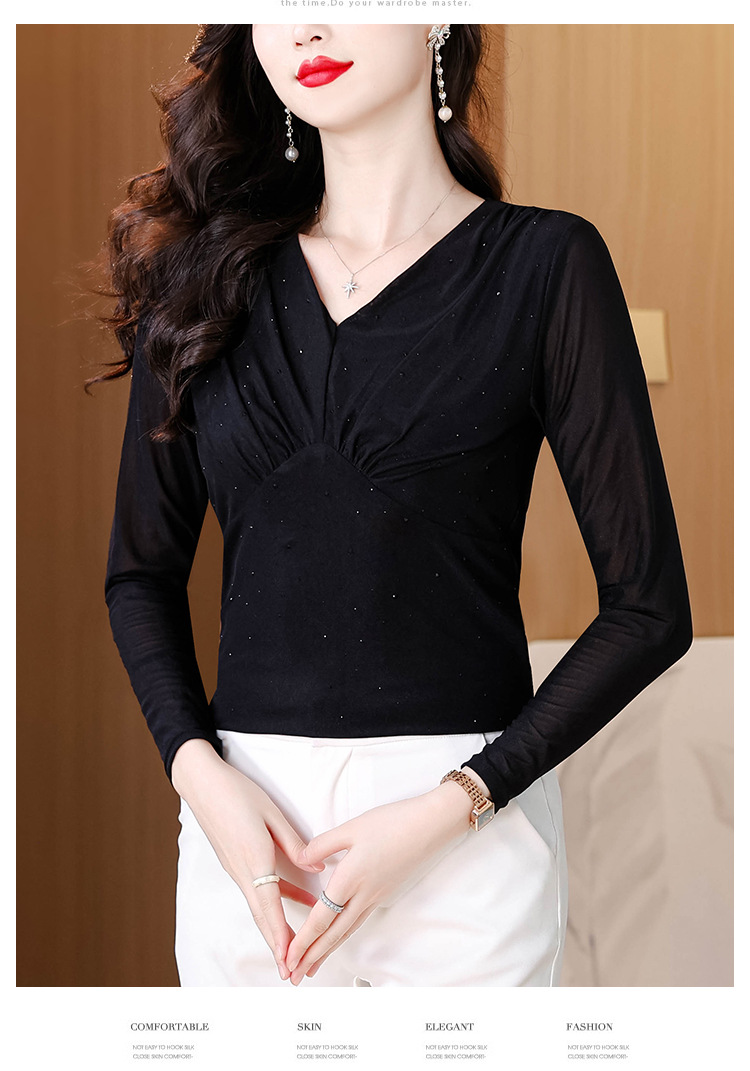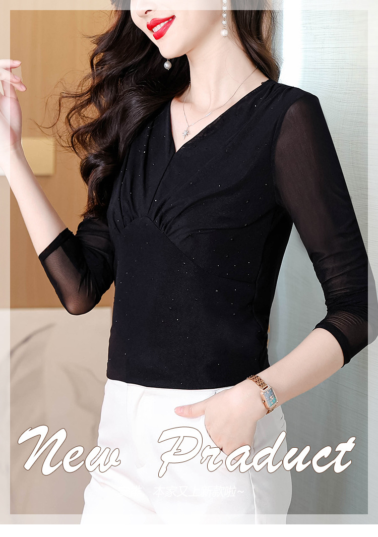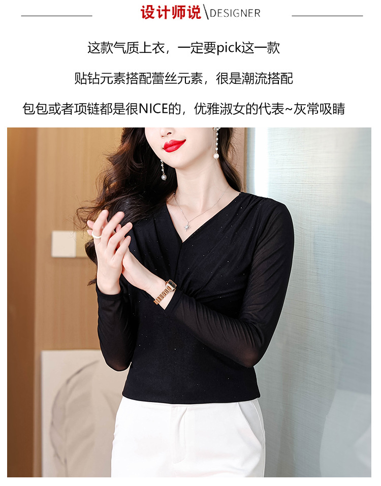 KQL C302N1785新品V领蕾丝网纱重工烫钻打底衫上衣修身显瘦T恤
