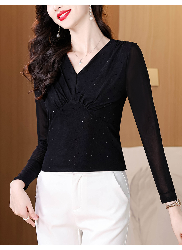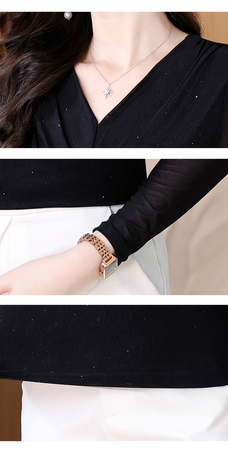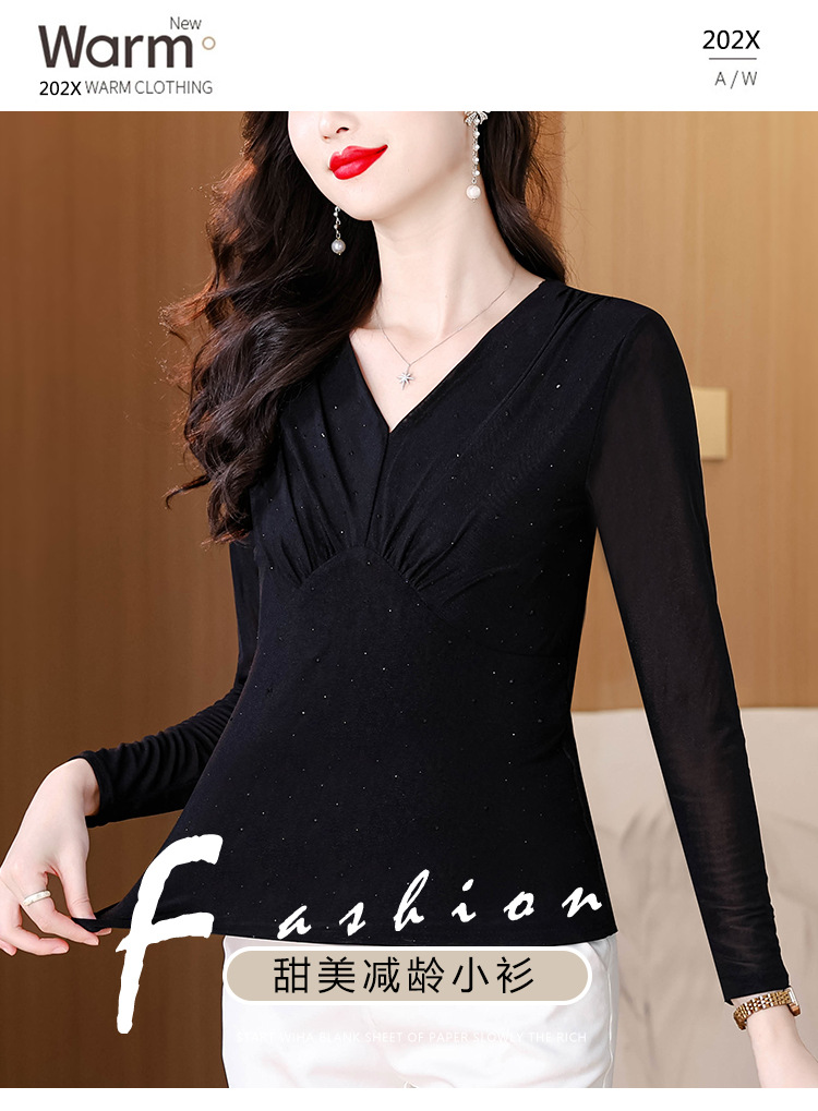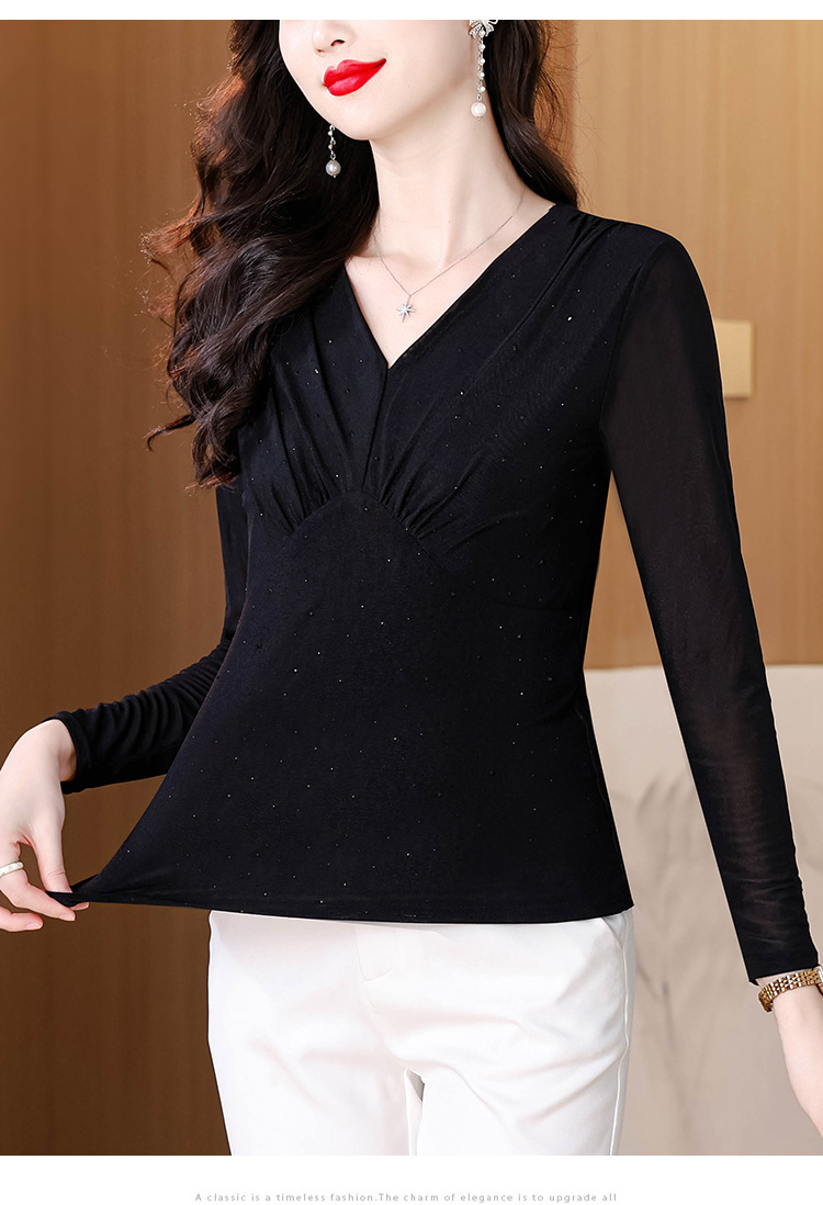 KQL C302N1785新品V领蕾丝网纱重工烫钻打底衫上衣修身显瘦T恤