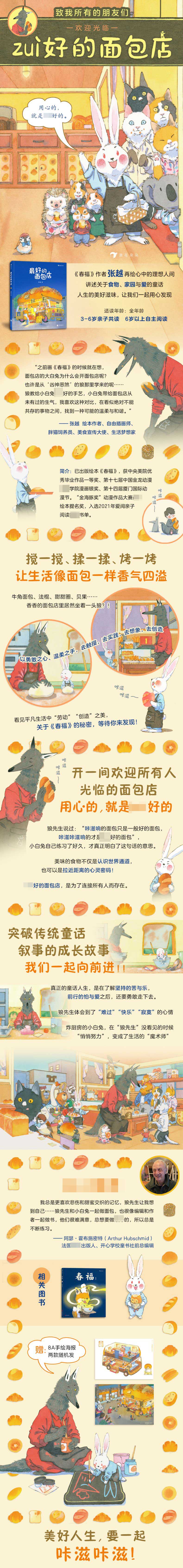 “之前画《春福》的时候就在想,面包店的大白兔为什么会开面包店呢?也许是从‘凶神恶煞’的狼那里学来的呢……”,《春福》之后,张越再次描绘“理想人间”中的小店故事,借助 “天真之眼”,看见平凡生活中“劳动”“创造”之美,在结尾跨页中,还隐藏了关于《春福》的秘密,你发现了吗?