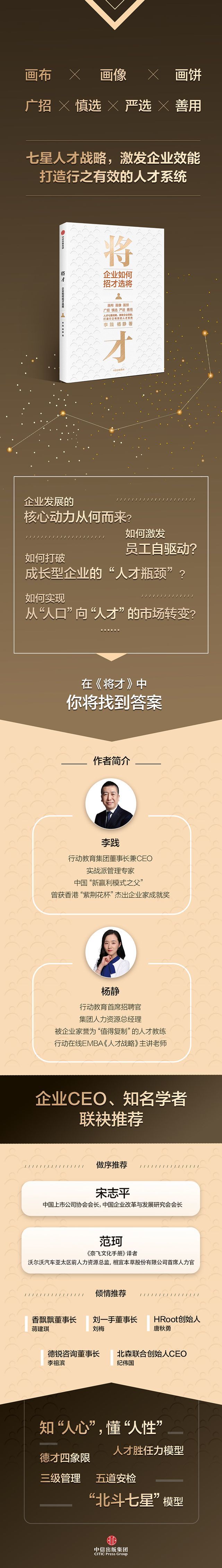 我非常欣慰地看到,由行动教育集团创始人李践老师和集团人力资源总经理杨静女士撰写的这本《将才》可以很好地帮助广大企业解决上述提到的招聘难题。作为行动教育集团的外部人力资源顾问,我和杨静总经理在打造人力资源团队和建设人力资源