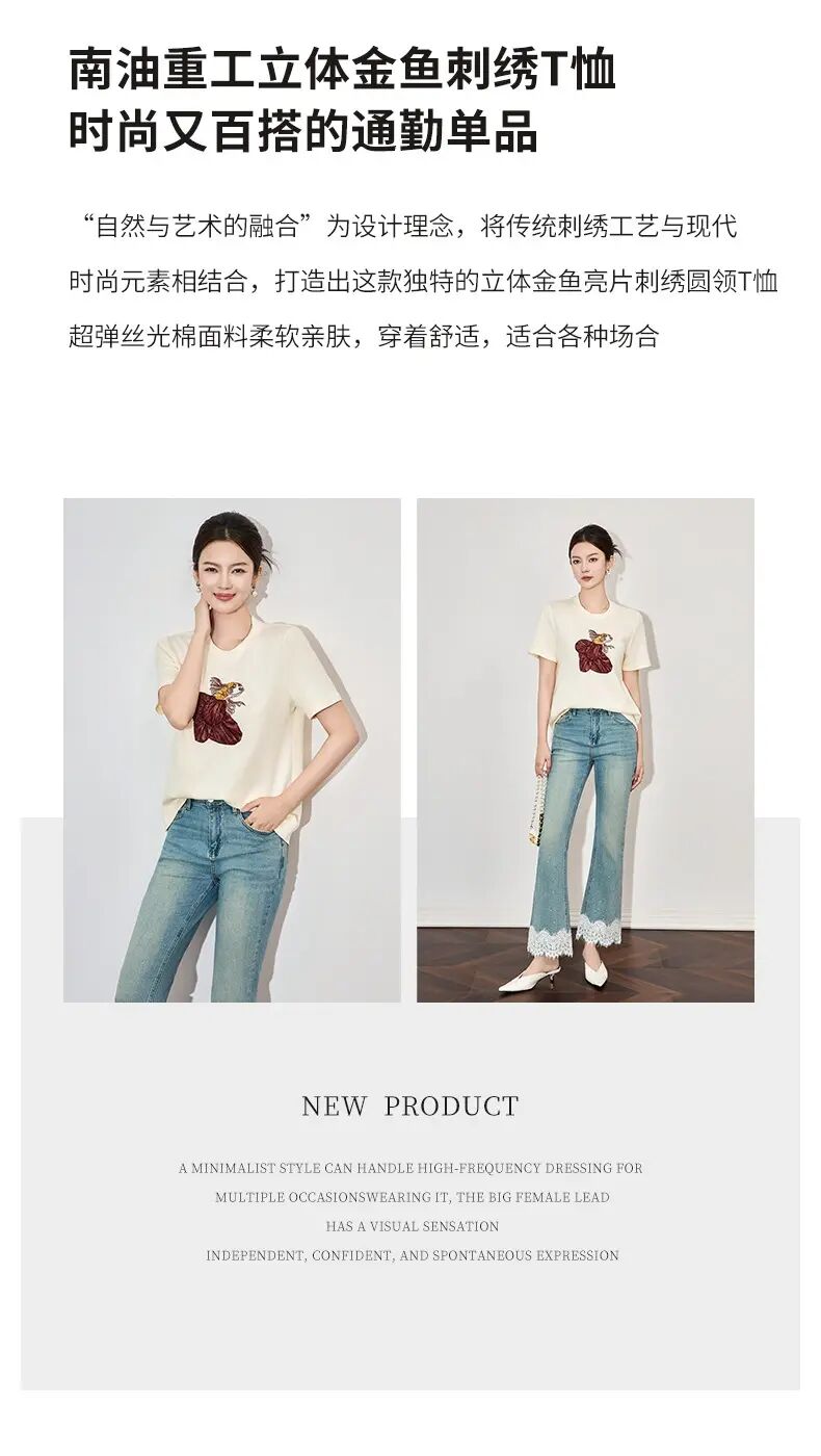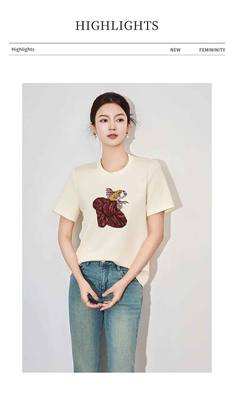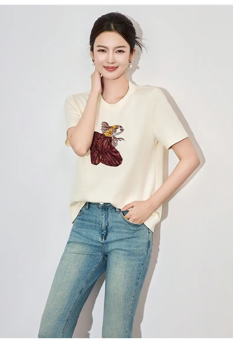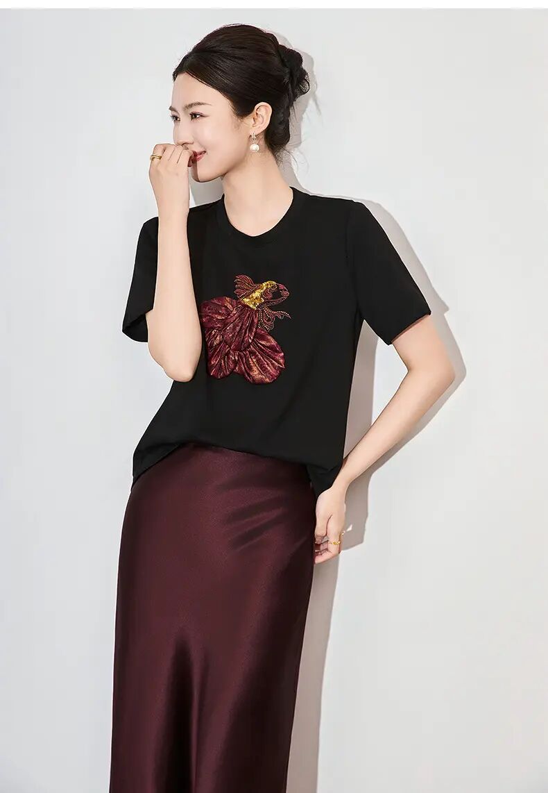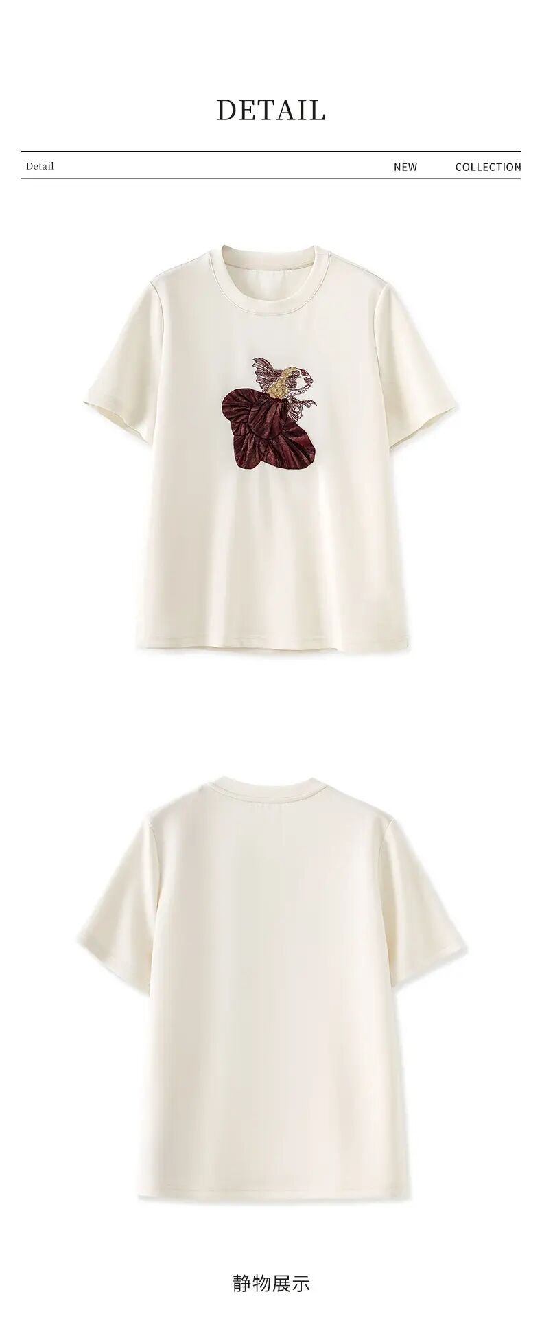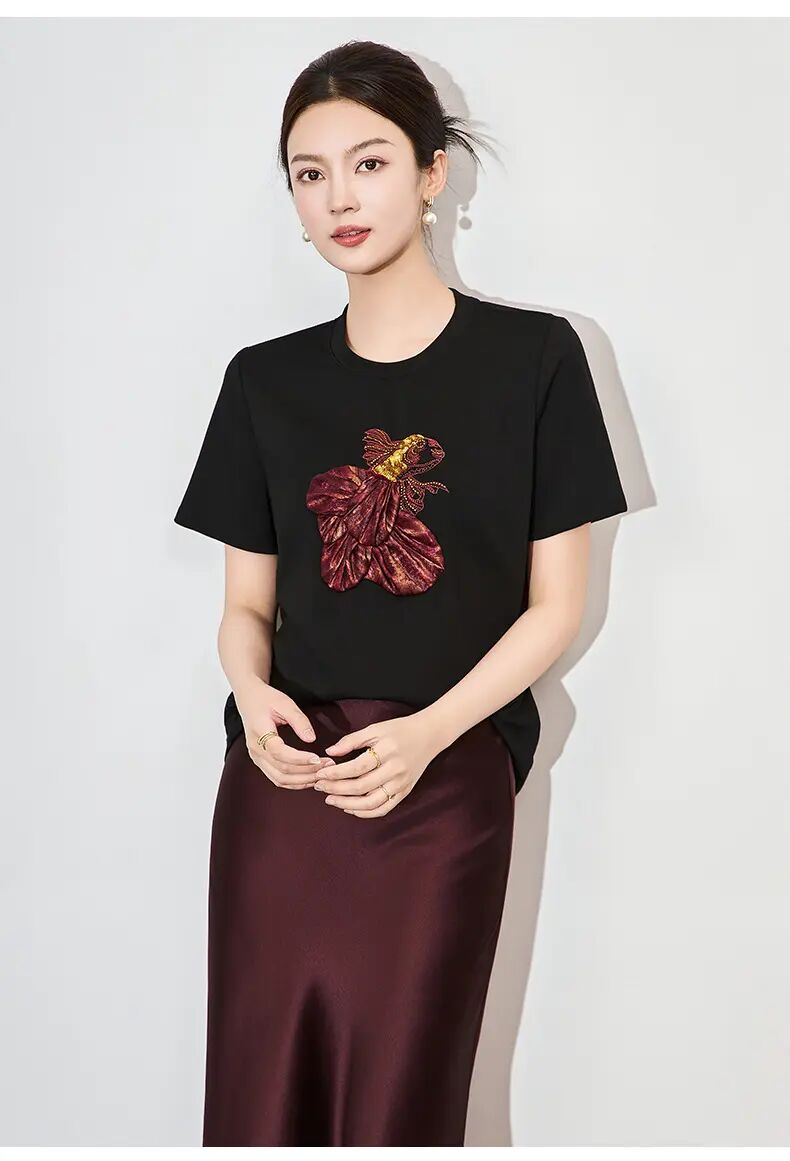 【高货wl】全新升级【铂金会员192/天猫259/差价67】(04449) 洛诗琳重工独特立体金鱼亮片刺绣高弹上衣时尚休闲洋气T恤