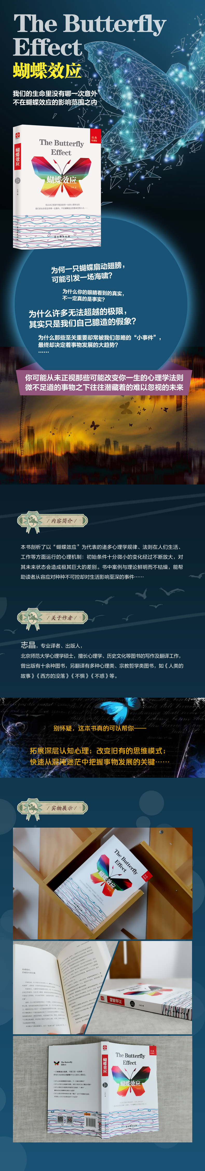 你从未正视却可能改变你一生的心理学法则:我们的生命里没有哪一次意外,不在蝴蝶效应的影响范围之内!为何一只蝴蝶扇动翅膀,可能引发一场海啸?原来,你所有行为的背后都藏着不为人知的心理效应……