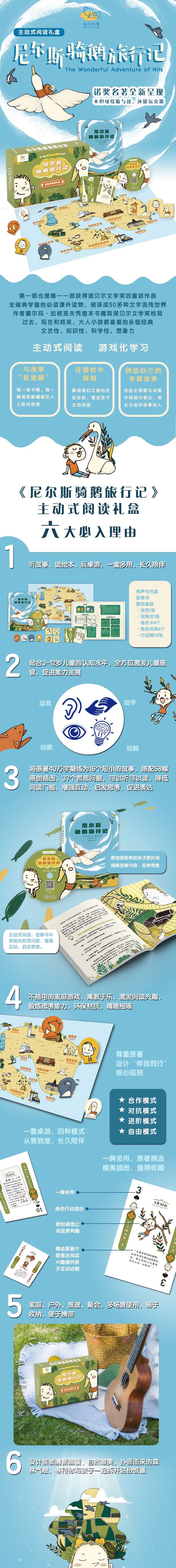 《尼尔斯骑鹅旅行记》是迄今为止唯一获得诺贝尔文学奖的童话作品;还是一部用讲故事的方式完成的瑞典儿童地理教科书;更是一部熊孩子的“变形记”。童时故事团队从3-12岁儿童的身心特点出发,同时考虑到不同时代和地域的文化差异,在原著基础上,提取并改编出16个故事,以有声书光盘、故事绘本和原创桌游相结合的形式,带给孩子全方位、立体化的阅读体验。