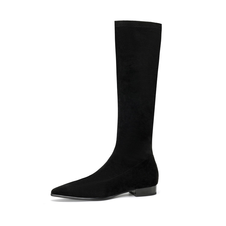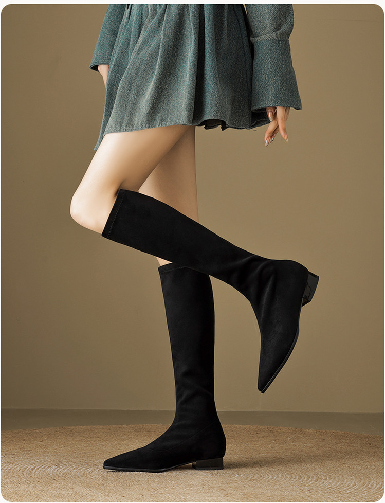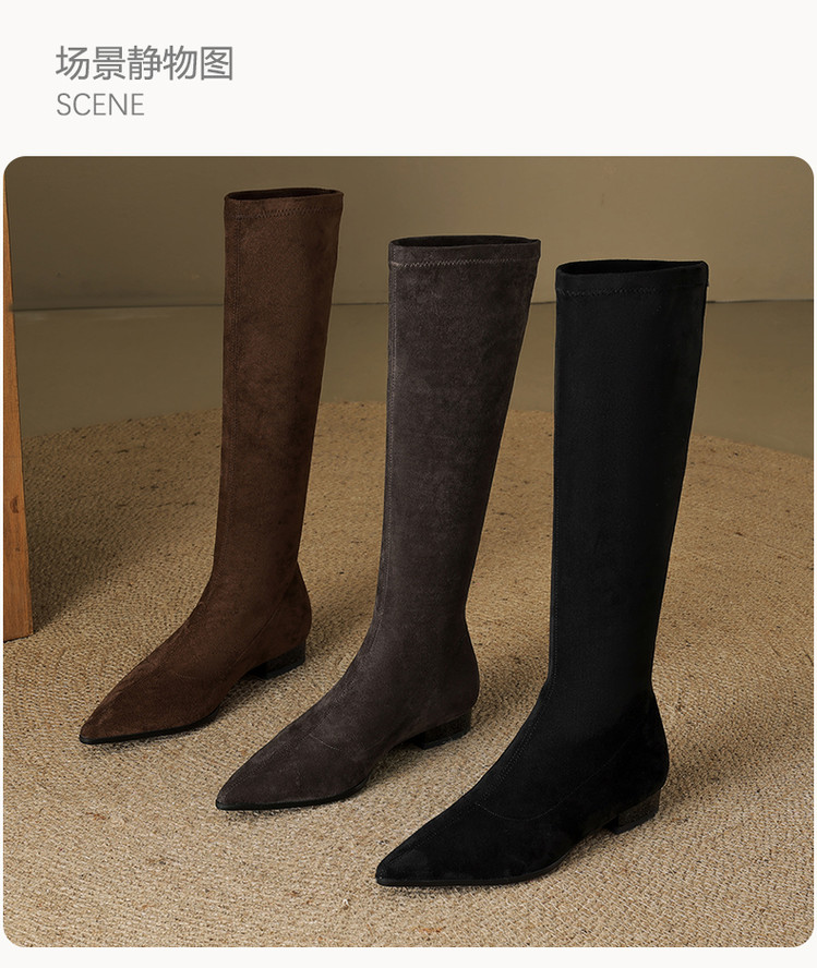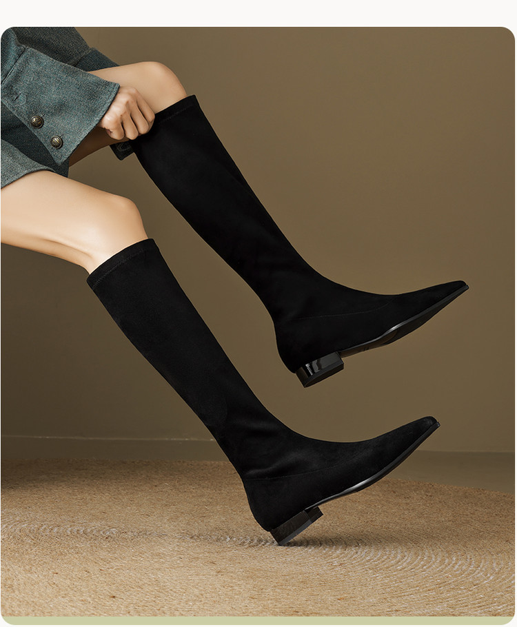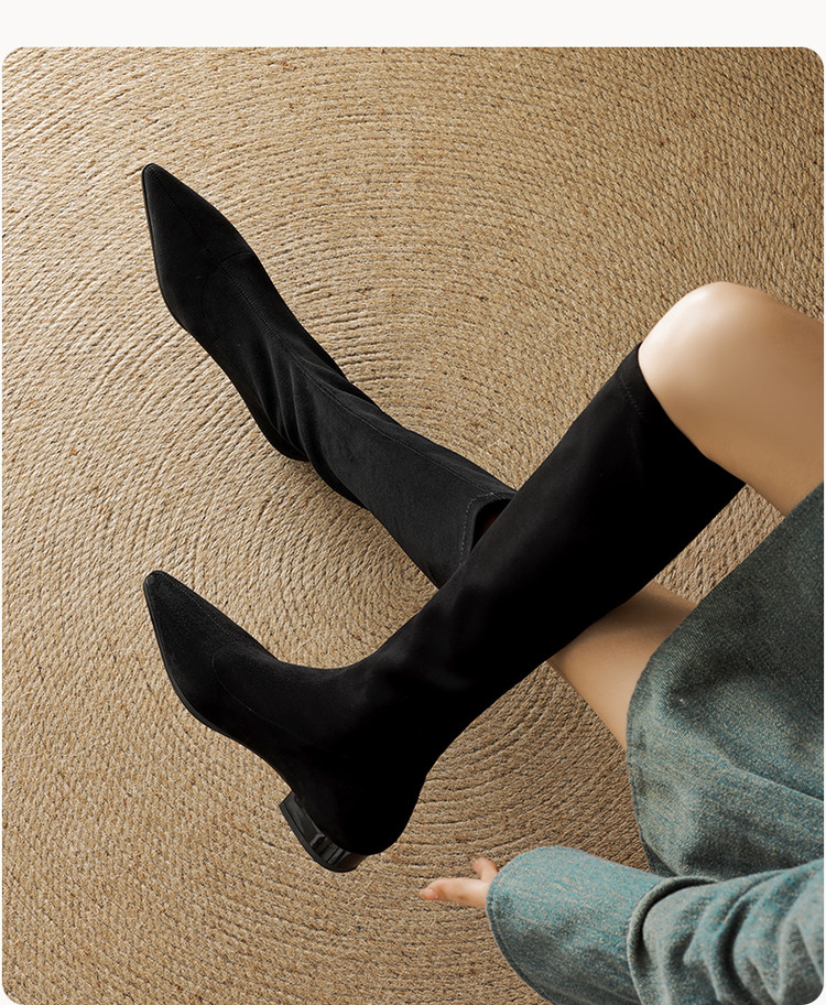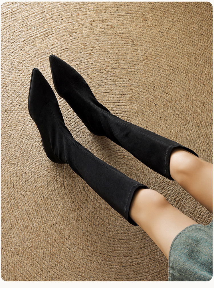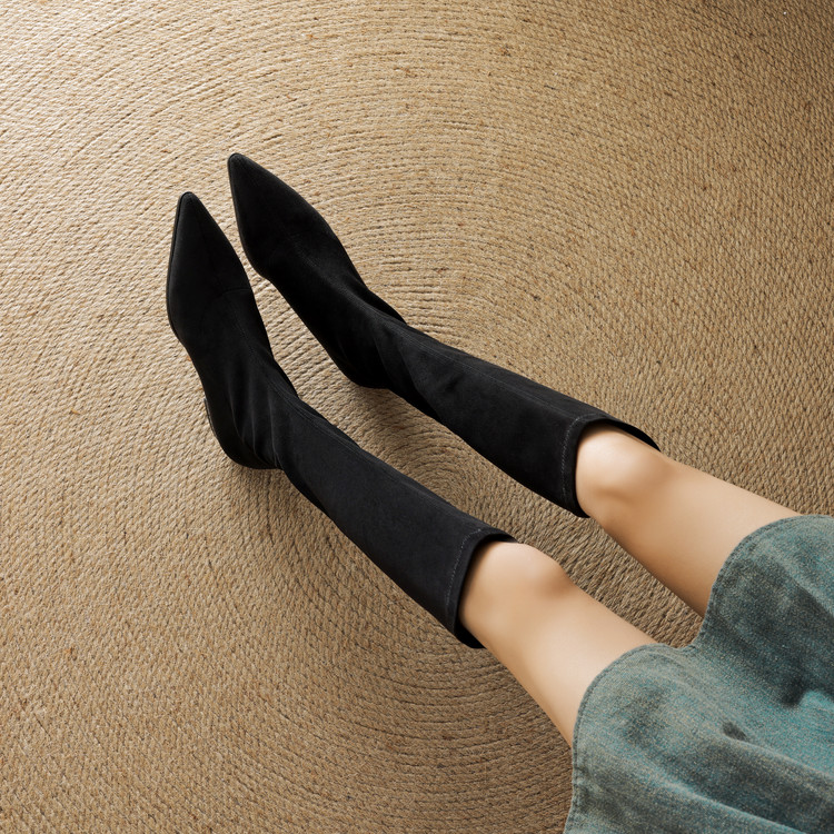 【预售7天】时尚气质尖头粗跟长筒靴女弹力瘦瘦靴绒面显瘦高筒长靴子HB&8889-1