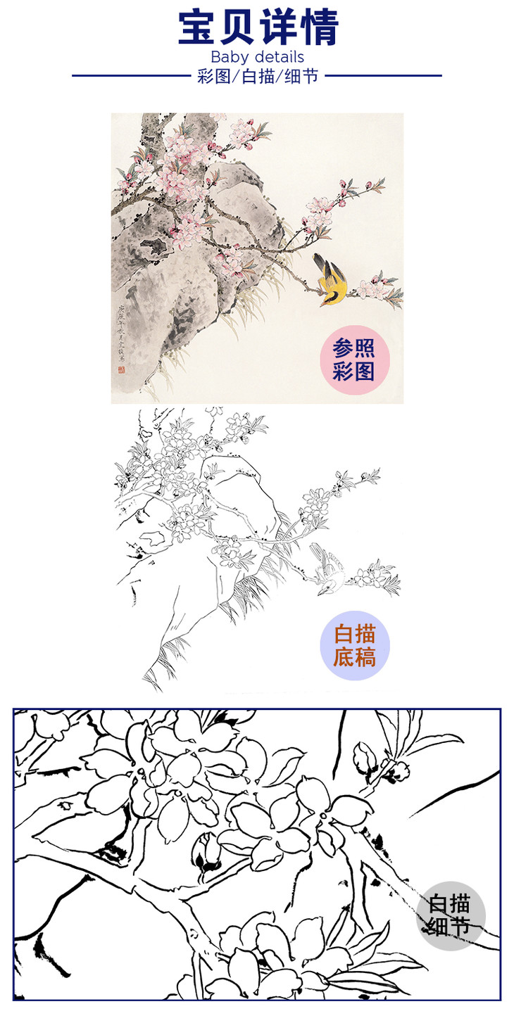 【有步骤、大彩图】李晓明工笔画白描底稿《相思瑶池春》牡丹相思鸟初学者临摹花鸟线稿KD20