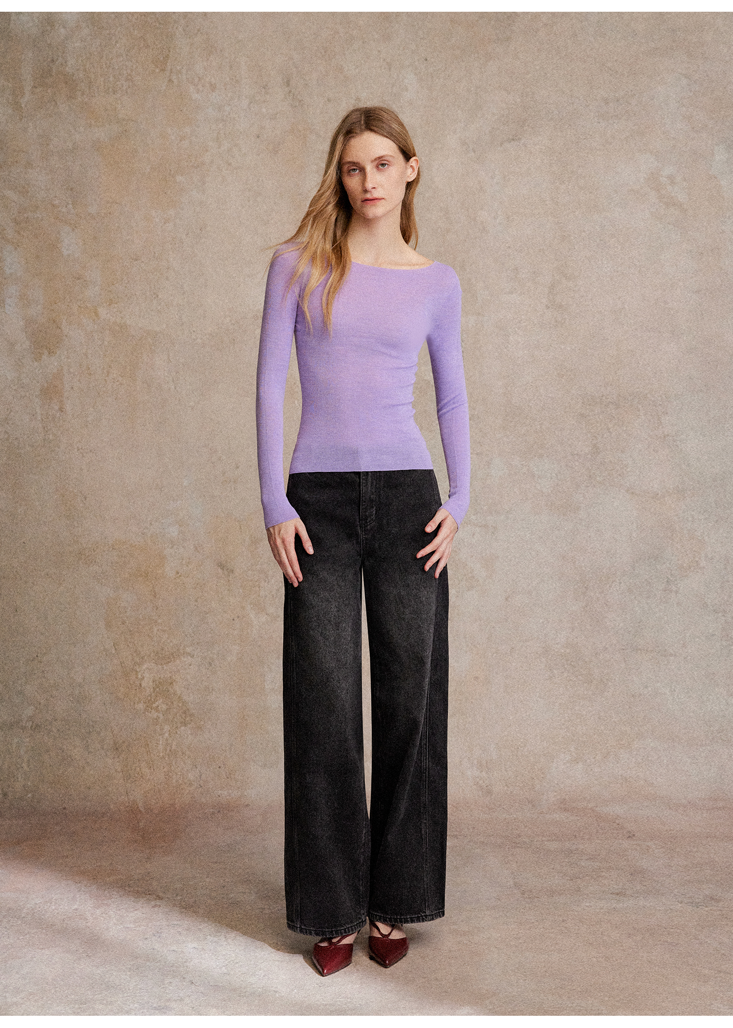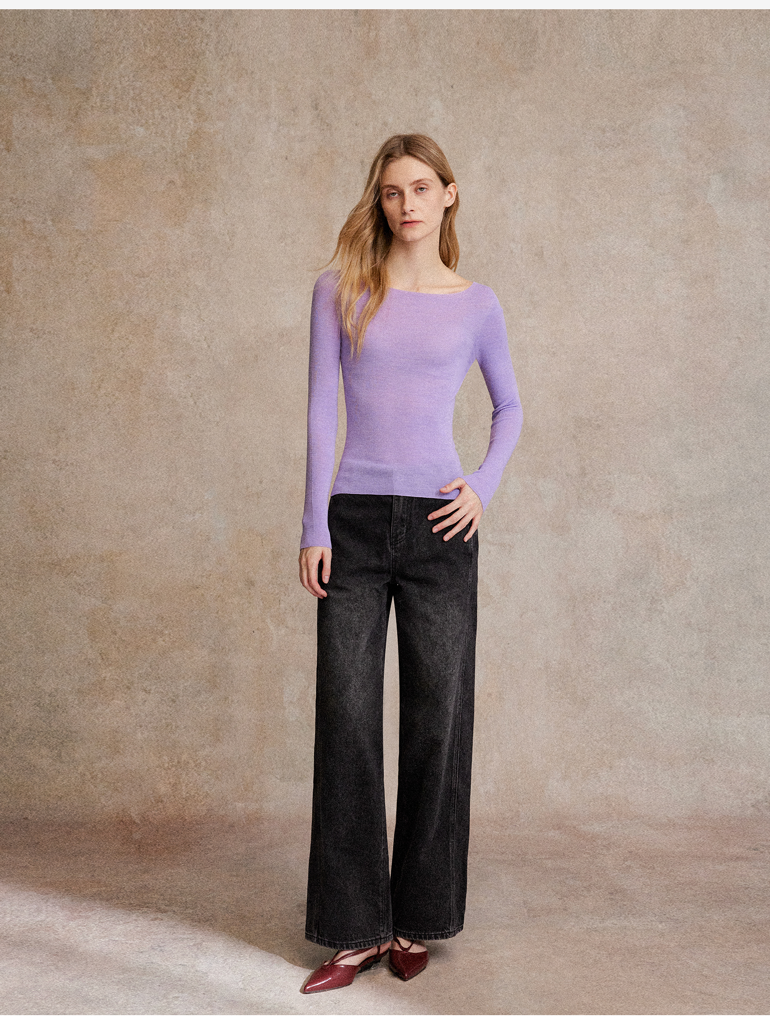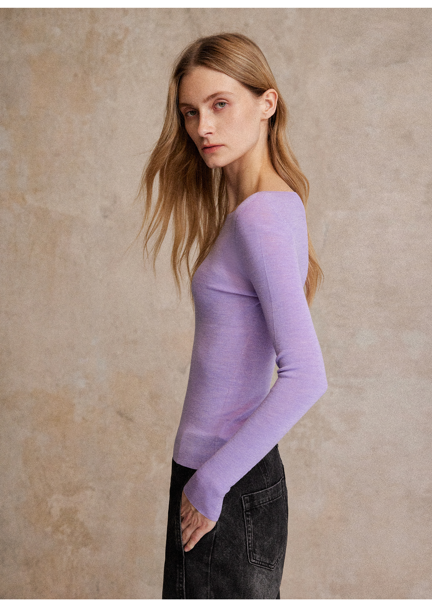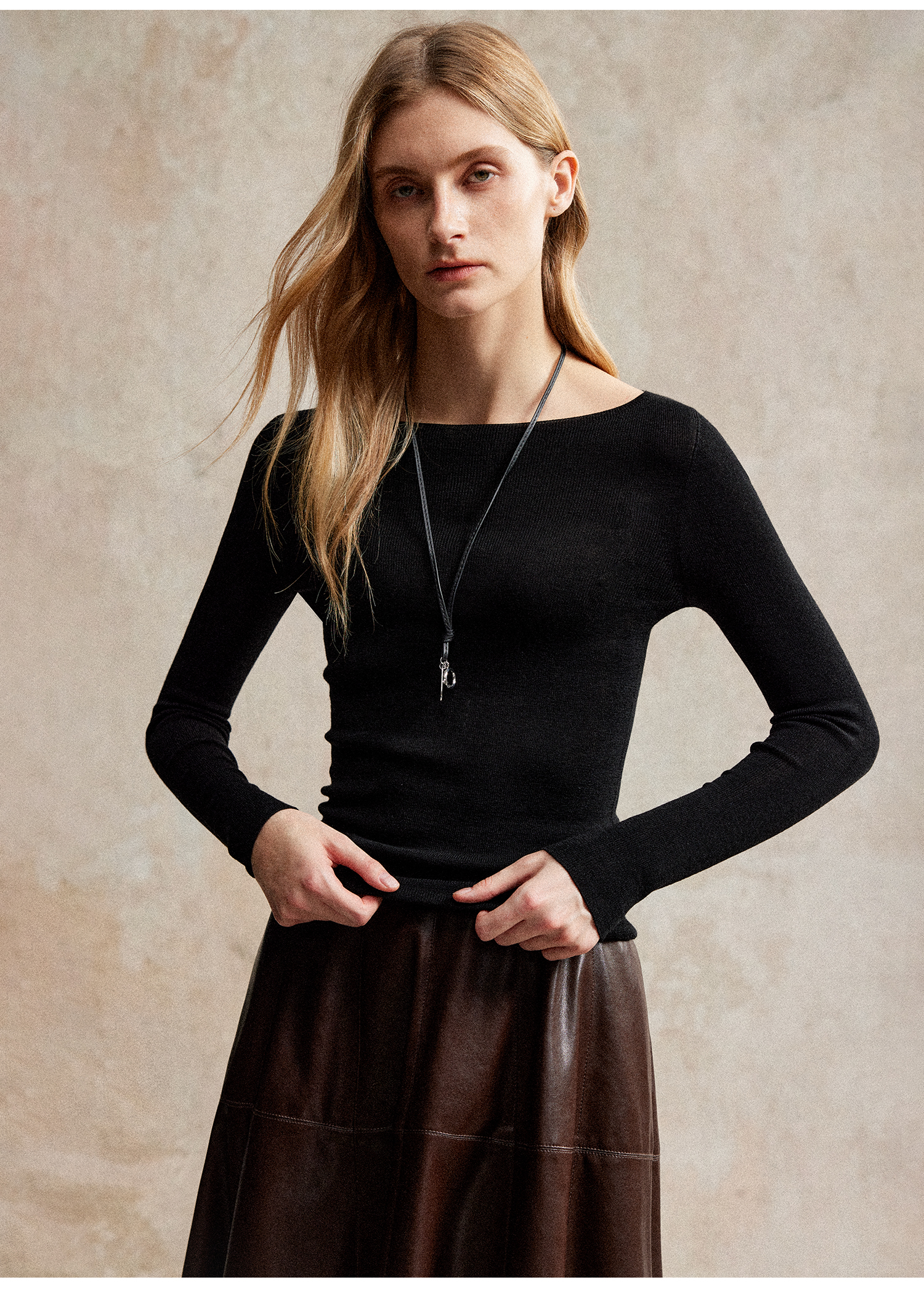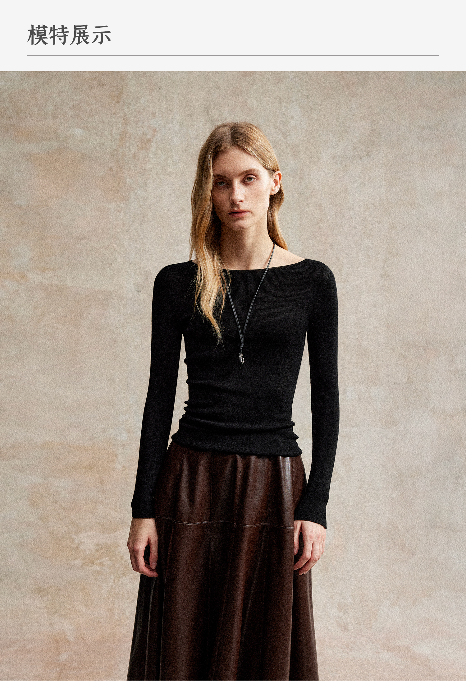 C+IMPRESS/西嘉精纺羊毛可机洗18针一体成型简约一字肩针织衫女秋